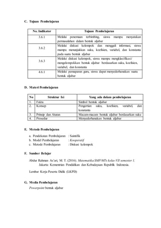Dokumen ini adalah rencana pelaksanaan pembelajaran (RPP) untuk mata pelajaran matematika di SMP Cipta Karya, yang berfokus pada bentuk aljabar selama satu pertemuan. Tujuan pembelajaran mencakup kemampuan siswa untuk menyatakan, menunjukkan, dan menyederhanakan bentuk aljabar dengan metode diskusi kelompok dan pendekatan saintifik. Sumber belajar yang digunakan adalah buku dari Kementerian Pendidikan dan Kebudayaan serta media pembelajaran berupa presentasi PowerPoint.