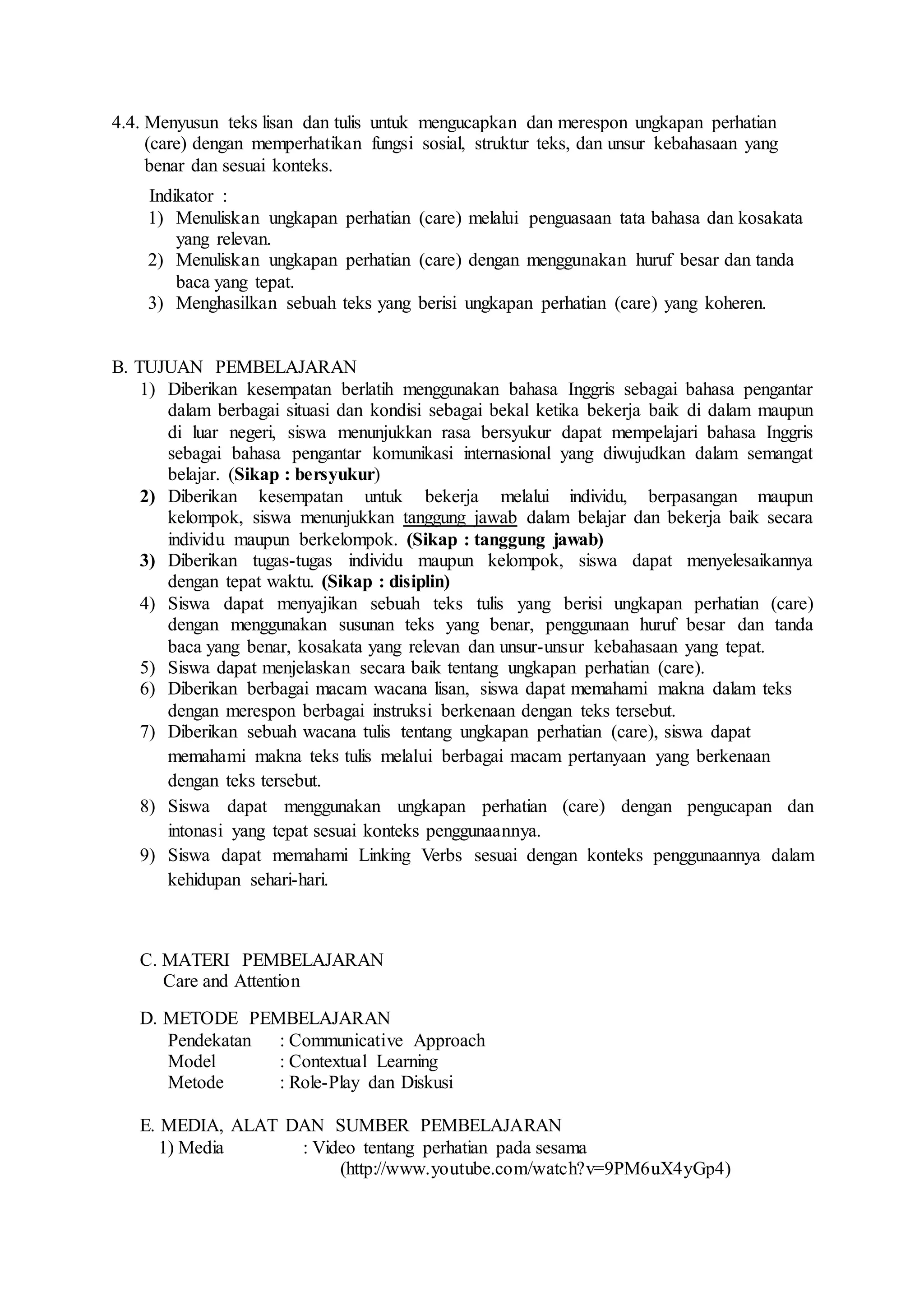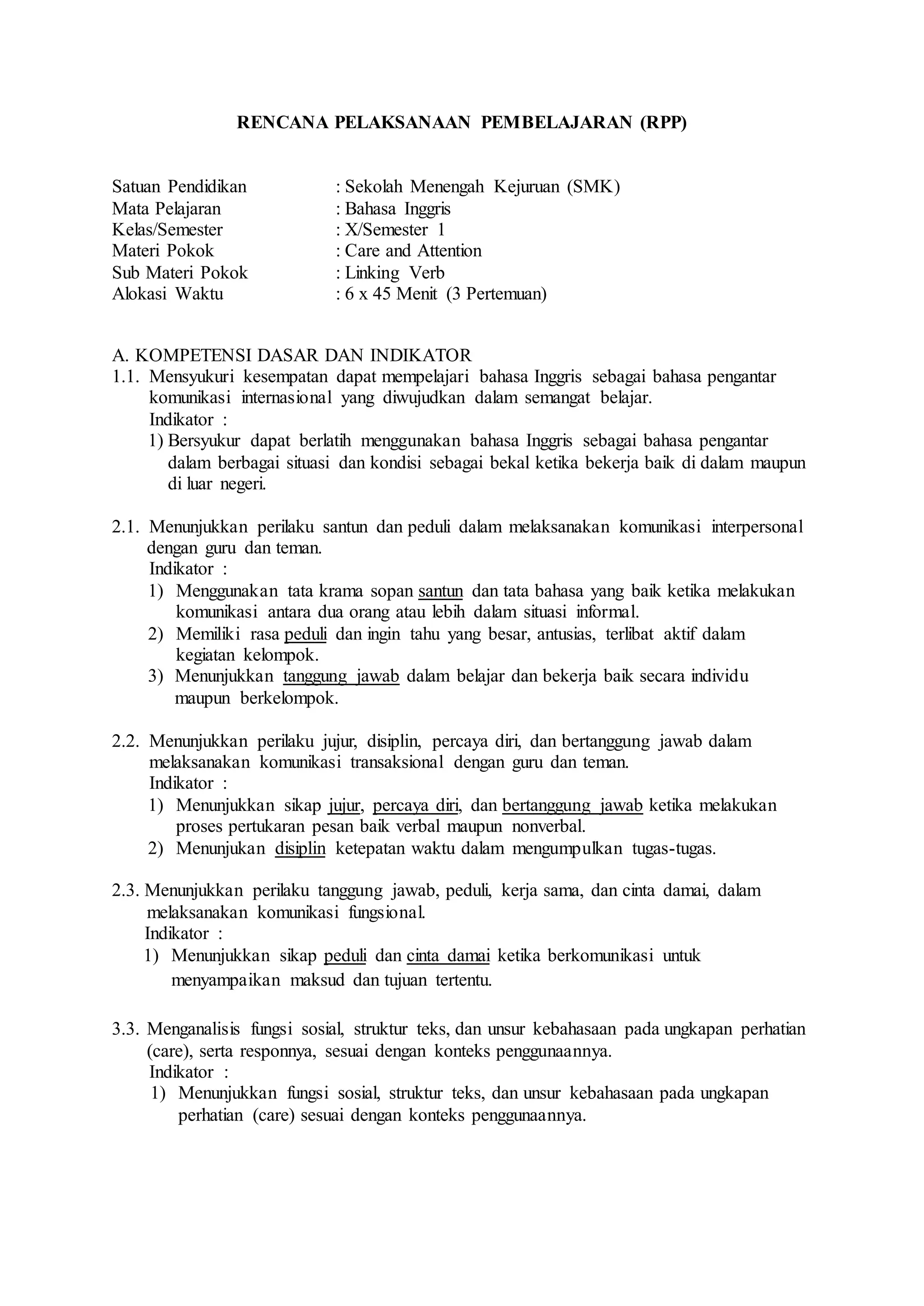 Dokumen ini adalah rencana pelaksanaan pembelajaran (RPP) untuk mata pelajaran Bahasa Inggris di SMK, dengan fokus pada materi ungkapan perhatian (care and attention) dan linking verbs. RPP ini mencakup kompetensi dasar, indikator, tujuan pembelajaran, metode, media, serta langkah-langkah dalam pelaksanaan pembelajaran selama tiga pertemuan. Siswa diharapkan dapat menggunakan bahasa Inggris dalam komunikasi, menunjukkan sikap santun, dan merespon ungkapan perhatian dengan tepat.
