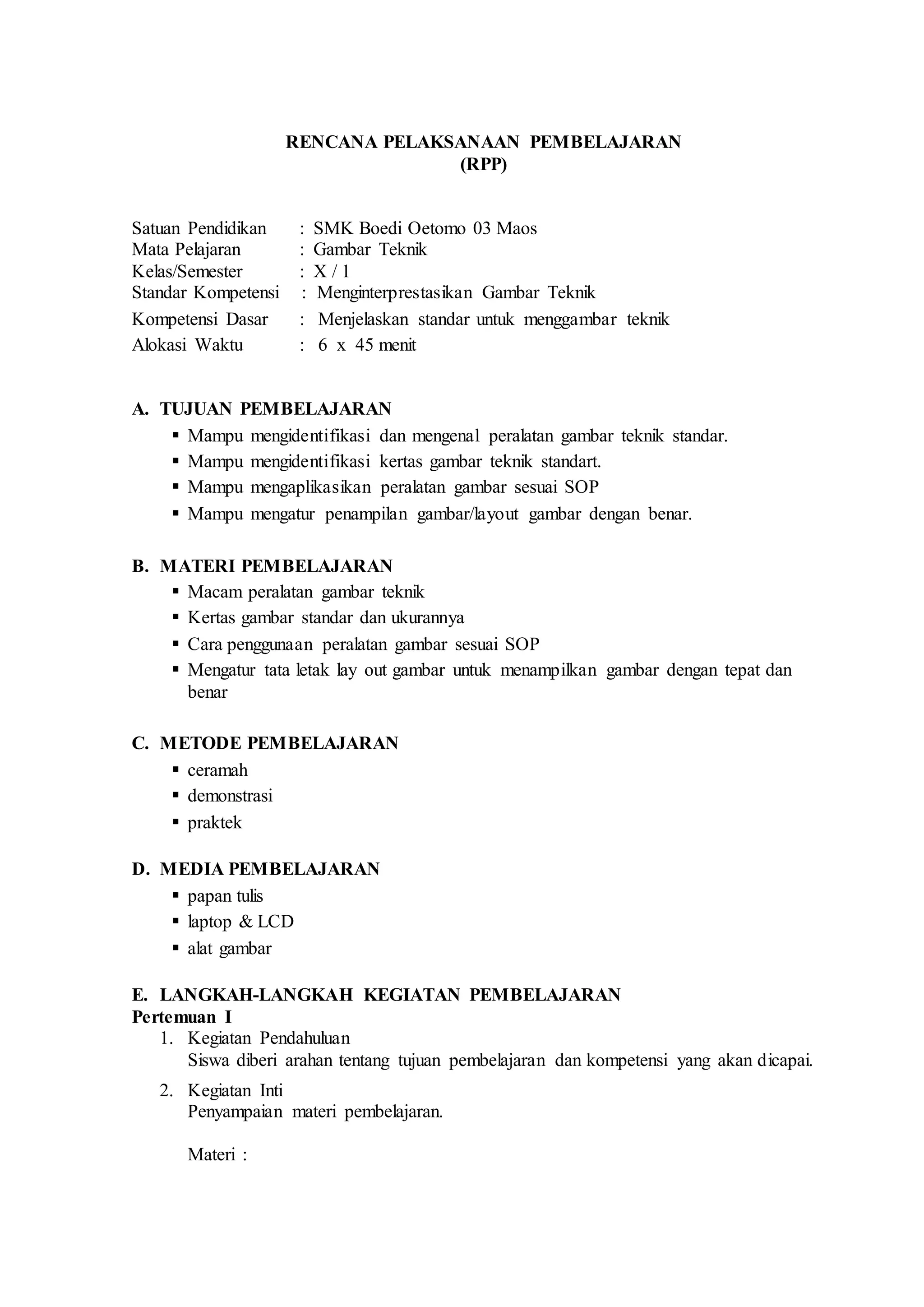 Rencana pelaksanaan pembelajaran (RPP) ini membahas tentang mata pelajaran Gambar Teknik untuk kelas X semester 1. RPP ini menjelaskan tujuan pembelajaran, materi, metode, dan langkah-langkah kegiatan pembelajaran yang mencakup penjelasan tentang peralatan gambar teknik, kertas gambar standar, cara penggunaan peralatan gambar, dan pengaturan tata letak gambar."