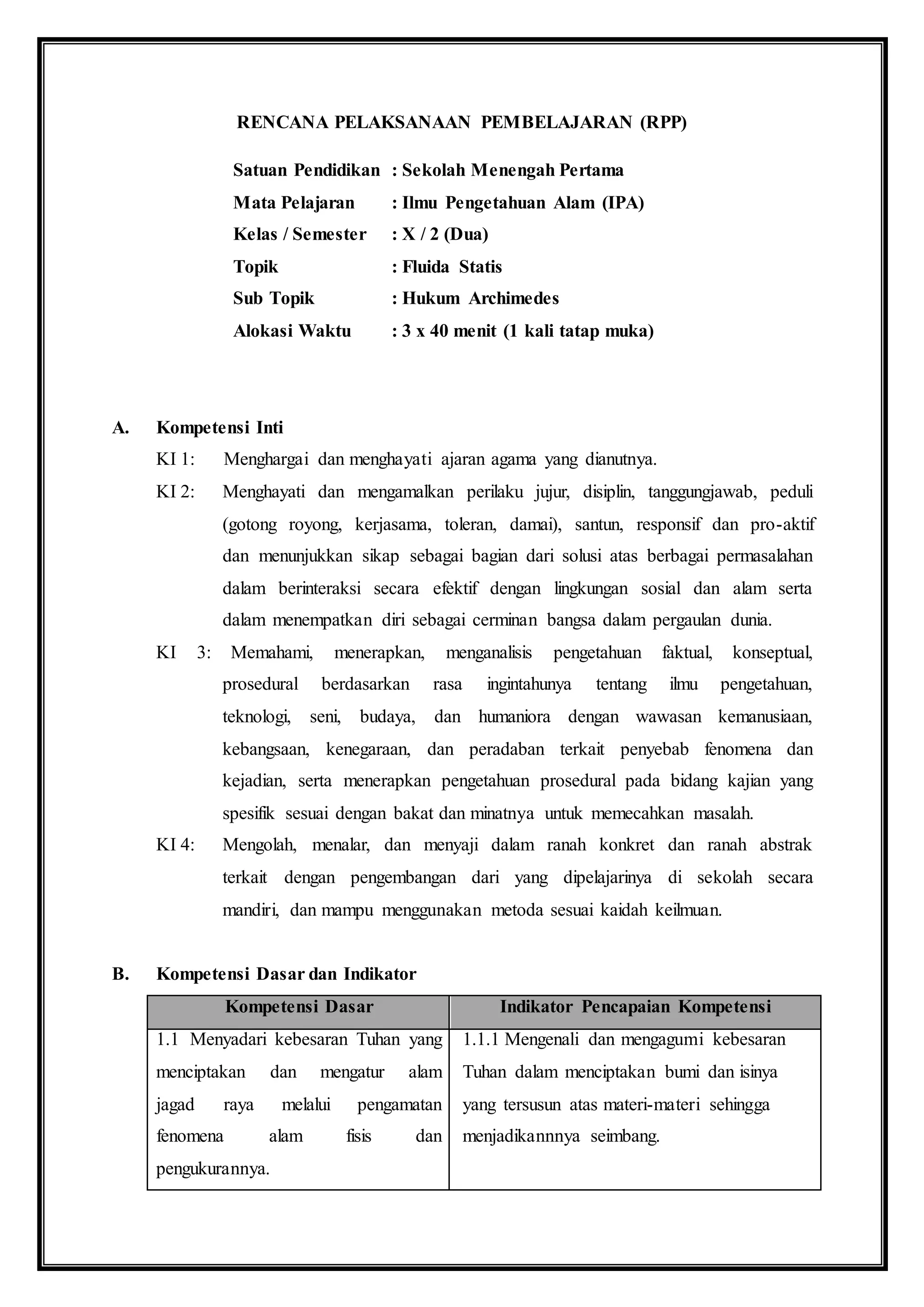 Dokumen ini adalah Rencana Pelaksanaan Pembelajaran (RPP) untuk mata pelajaran Ilmu Pengetahuan Alam kelas X mengenai topik Fluida Statis dan Hukum Archimedes. RPP mencakup kompetensi inti, kompetensi dasar, tujuan pembelajaran, materi ajar, serta langkah-langkah kegiatan pembelajaran selama tiga pertemuan. Metode pembelajaran yang digunakan adalah Scientific Problem Based Learning (PBL) dengan berbagai pendekatan dan alat bantu, serta penilaian terhadap sikap dan kemampuan siswa dalam percobaan dan diskusi.