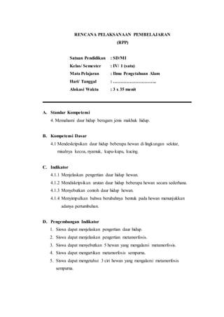 Dokumen ini adalah rencana pelaksanaan pembelajaran (RPP) untuk kelas IV SD tentang materi daur hidup hewan, yang mencakup standar kompetensi, kompetensi dasar, dan indikator belajar. Pembelajaran ini dirancang untuk membantu siswa memahami pengertian, jenis, dan proses metamorfosis berbagai hewan, serta melibatkan berbagai metode dan media pembelajaran. Selain itu, RPP ini juga mencakup evaluasi dan refleksi pembelajaran yang akan dilakukan selama dan setelah proses pembelajaran.