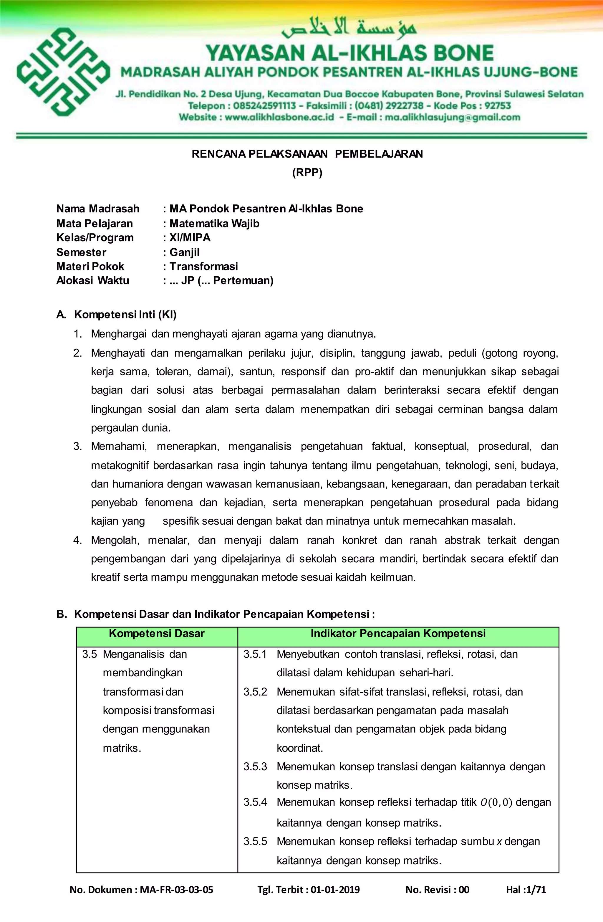 Rencana pelaksanaan pembelajaran ini membahas tentang transformasi matematika pada materi pokok transformasi untuk siswa kelas XI Program MIPA. Pembelajaran akan meliputi konsep translasi, refleksi, rotasi, dan dilatasi beserta contoh-contohnya dalam kehidupan sehari-hari serta kaitannya dengan konsep matriks. Tujuan pembelajaran adalah agar siswa dapat memahami keempat jenis transformasi tersebut dan mampu men