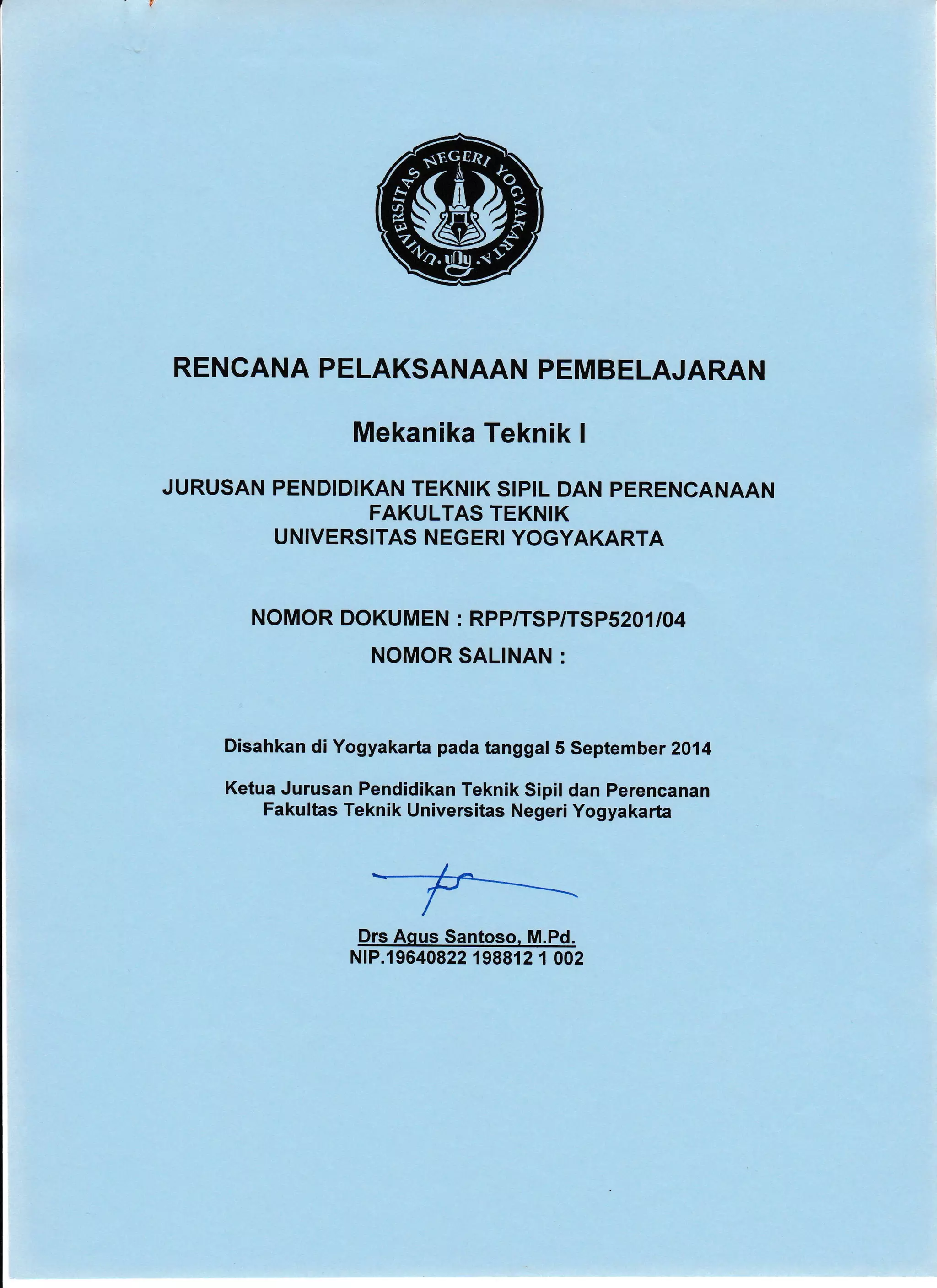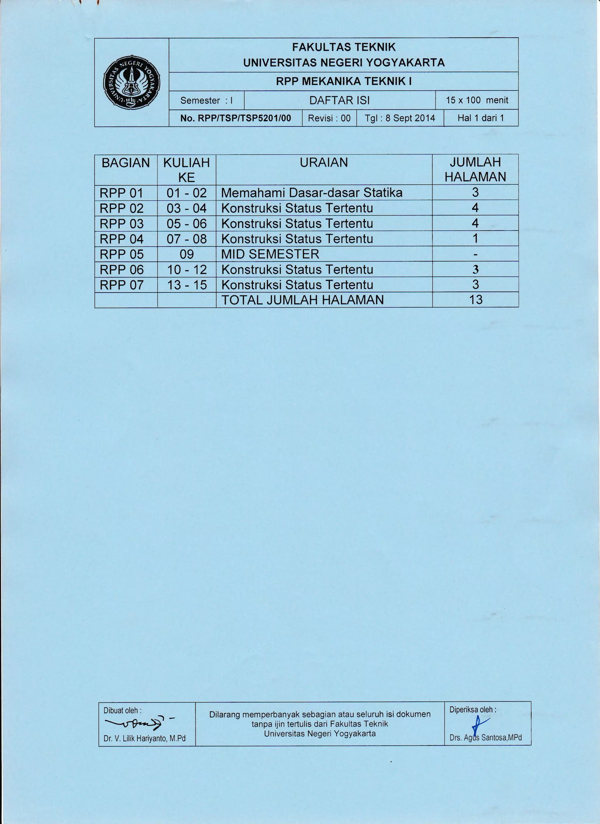 Dokumen ini adalah rencana pelaksanaan pembelajaran untuk mata kuliah Mekanika Teknik I di Universitas Negeri Yogyakarta, yang mencakup pengajaran dasar-dasar statika dan konstruksi statis tertentu. Struktur pembelajaran dirancang untuk mencakup tujuan pembelajaran, materi ajar, metode pengajaran, serta penilaian. Terdapat pula referensi dan sumber belajar yang mendukung pelaksanaan mata kuliah ini.