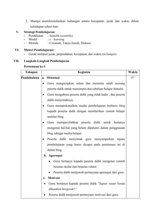 (1) Dokumen tersebut merupakan rencana pelaksanaan pembelajaran (RPP) mata pelajaran fisika untuk kelas X semester 1 di SMA Negeri 3 Cikarang Utara. (2) RPP tersebut membahas tentang gerak lurus beraturan, termasuk konsep jarak, perpindahan, kecepatan dan waktu. (3) Pembelajaran akan dilaksanakan secara e-learning melalui blog dengan metode