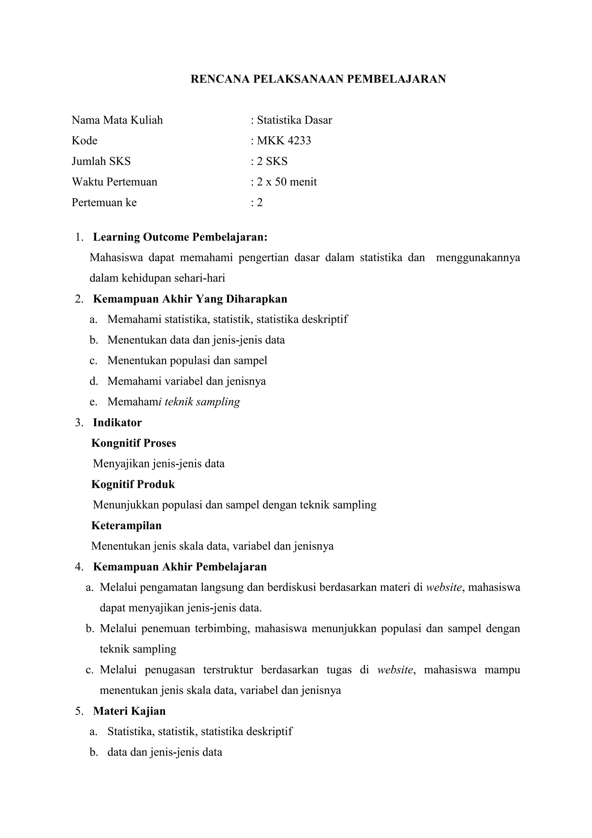Dokumen ini adalah rencana pelaksanaan pembelajaran untuk mata kuliah Statistika Dasar dengan tujuan agar mahasiswa memahami pengertian dasar dalam statistika dan penerapannya dalam kehidupan sehari-hari. Rencana ini mencakup kemampuan akhir yang diharapkan, materi kajian, model pembelajaran, serta metode penilaian. Pembelajaran dilakukan melalui kegiatan interaktif seperti diskusi kelompok dan presentasi untuk meningkatkan pemahaman mahasiswa.