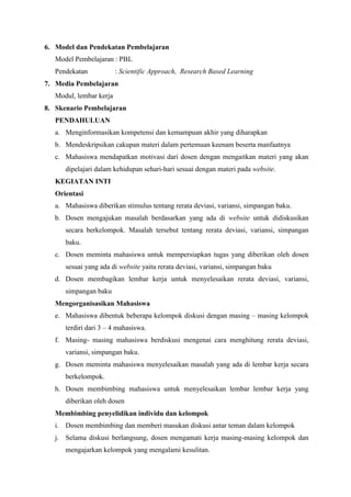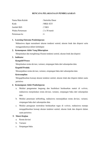 Dokumen ini adalah rencana pelaksanaan pembelajaran untuk mata kuliah Statistika Dasar yang mencakup tujuan pembelajaran, materi kajian, model pengajaran, serta penilaian. Mahasiswa diharapkan dapat memahami dan menghitung ukuran tendensi sentral, ukuran letak, dan dispersi melalui berbagai metode pembelajaran termasuk diskusi kelompok dan penugasan. Penilaian dilakukan berdasarkan sikap, pengetahuan, dan keterampilan dengan rujukan dari beberapa sumber literatur.