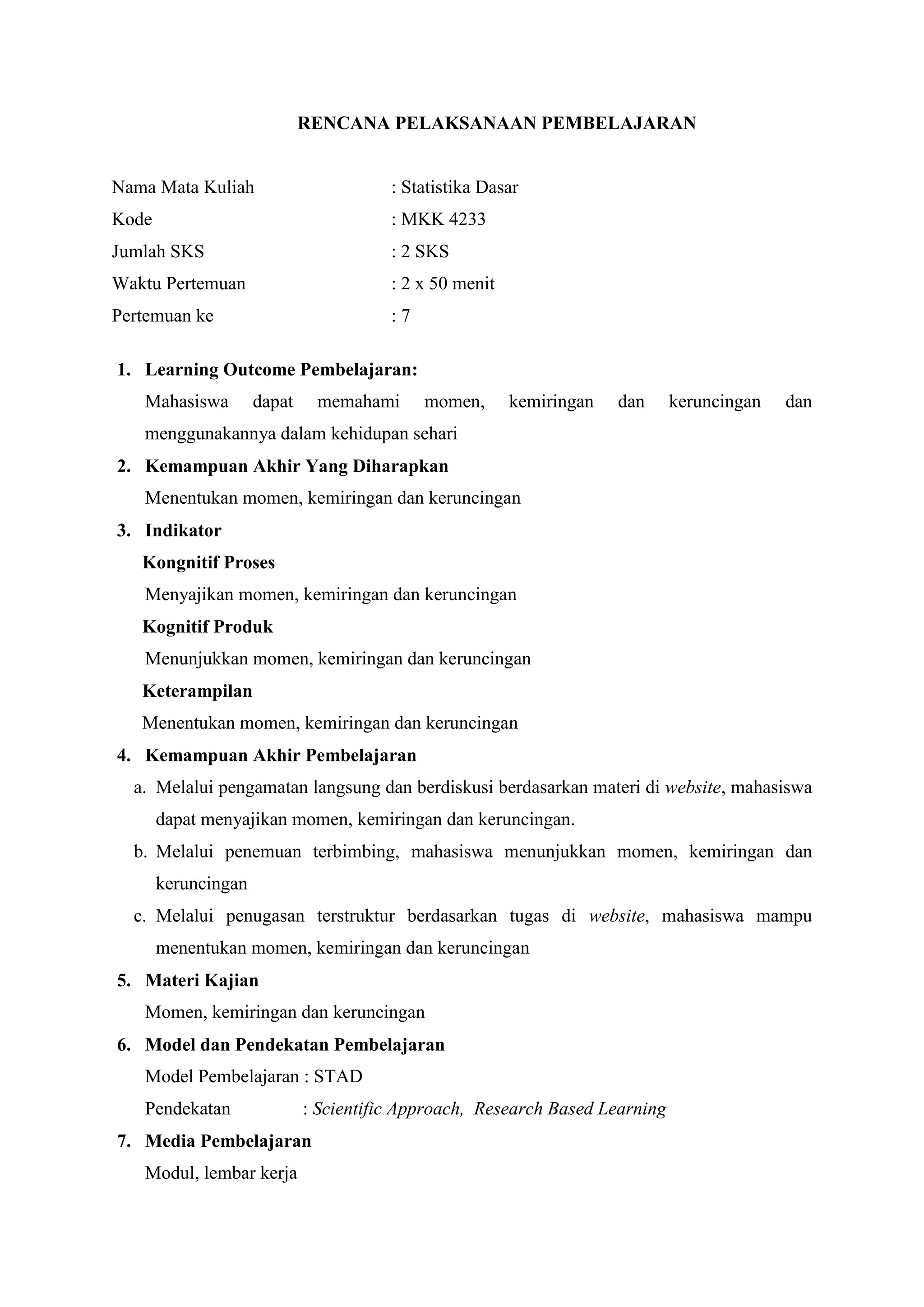 Dokumen ini menjabarkan rencana pelaksanaan pembelajaran mata kuliah Statistika Dasar, dengan fokus pada pemahaman mahasiswa tentang momen, kemiringan, dan keruncingan. Metode pembelajaran yang digunakan termasuk model STAD dan pendekatan berbasis penelitian, serta melibatkan diskusi kelompok dan presentasi. Penilaian mencakup sikap, pengetahuan, dan keterampilan dengan berbagai referensi untuk mendukung materi ajar.
