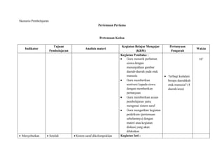 Dokumen ini menjelaskan rencana pelaksanaan pembelajaran biologi untuk kelas XI SMA mengenai struktur dan fungsi sistem regulasi manusia, termasuk sistem saraf dan penyimpangan yang mungkin terjadi. Metode pengajaran meliputi diskusi, eksperimen, dan tugas, dengan alokasi waktu 2×45 menit per pertemuan. Indikator pembelajaran mencakup pemahaman mengenai bagian-bagian sistem saraf serta perbedaan fungsi sistem saraf simpatik dan parasimpatik.