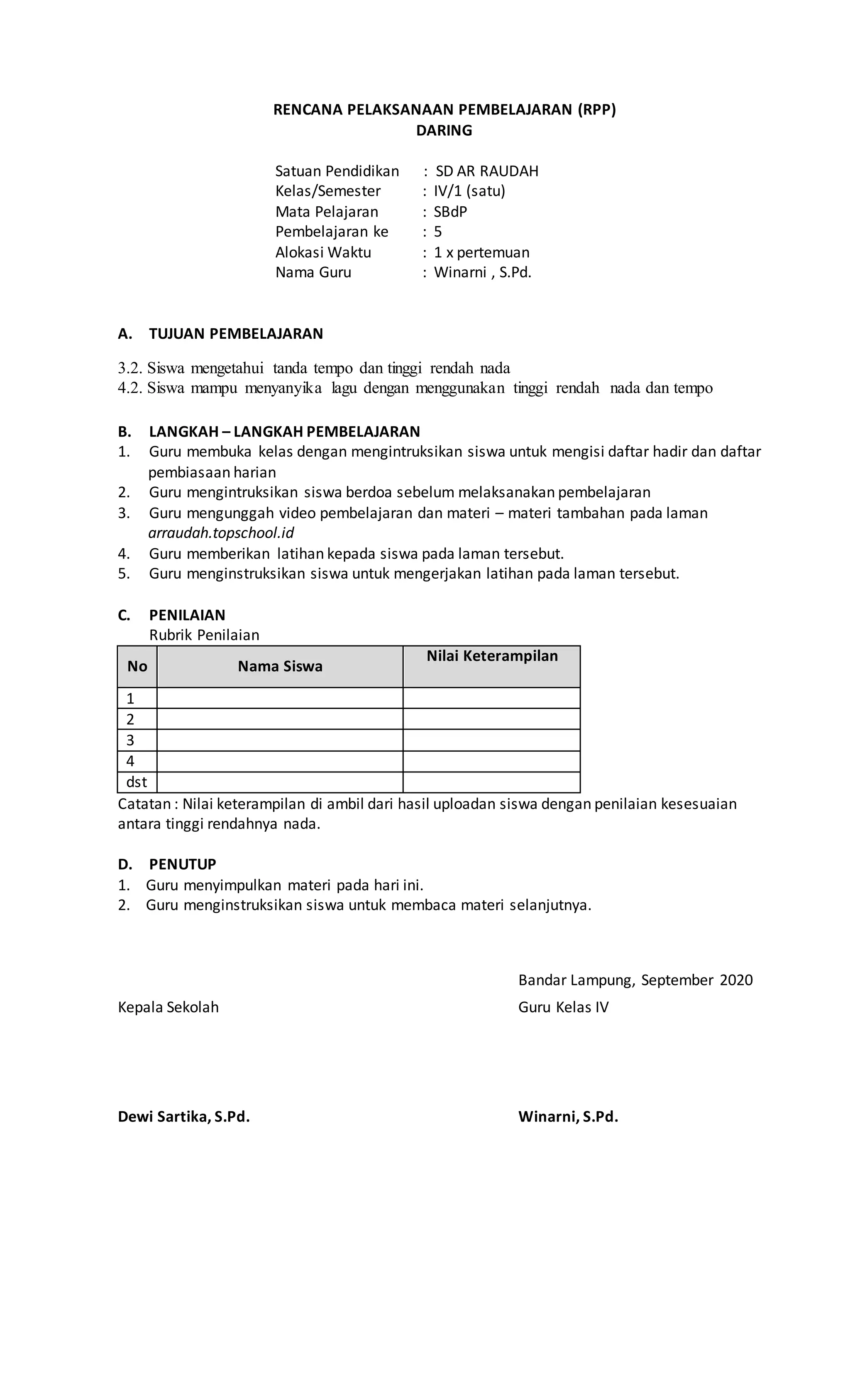 Rencana pelaksanaan pembelajaran (RPP) ini membahas pembelajaran daring kelas IV tentang Seni Budaya dan Prakarya (SBdP) tentang tanda tempo dan tinggi rendah nada lagu, di mana siswa diajarkan mengenali dan menyanyikan lagu dengan menggunakan unsur tersebut. Guru akan membuka kelas secara daring, mengunggah video dan materi pelajaran, memberikan latihan, menilai hasil kerja siswa, dan menyimpulkan materi.
