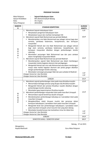 Program tahunan mata pelajaran Sejarah Kebudayaan Islam di MTs Muhammadiyah Batang untuk kelas VII meliputi 2 semester dengan standar kompetensi membahas sejarah kebudayaan Islam, Nabi Muhammad SAW di Mekkah dan Madinah."
