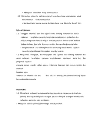 Dokumen ini adalah rencana pelaksanaan pembelajaran untuk SD kelas V dengan tema benda-benda di lingkungan sekitar dan subtema perubahan wujud benda. Pembelajaran mencakup pengenalan kebutuhan masyarakat, pembagian pecahan, serta pengaruh aktivitas manusia terhadap alam, dengan metode pengajaran seperti diskusi dan percobaan. Tujuan pembelajaran melibatkan identifikasi kebutuhan masyarakat dan pemahaman tentang dampak kegiatan manusia terhadap lingkungan.