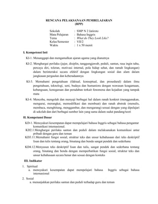 Rencana pelaksanaan pembelajaran (RPP) ini membahas tentang deskripsi benda sederhana dalam bahasa Inggris untuk siswa kelas 7 SMP. RPP ini menjelaskan kompetensi dasar, indikator, tujuan, materi, metode pembelajaran, dan penilaian yang akan dilakukan.