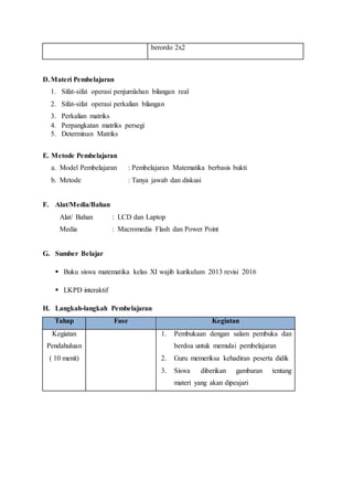 Dokumen ini adalah rencana pelaksanaan pembelajaran matematika untuk kelas XI yang berfokus pada determinan matriks. Dalam satu pertemuan, siswa akan belajar tentang sifat dan teorema determinan matriks 2x2 dan 3x3 melalui diskusi dan kerja kelompok. Penilaian dilakukan pada aspek afektif, kognitif, dan psikomotorik selama proses pembelajaran.