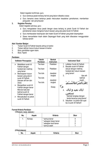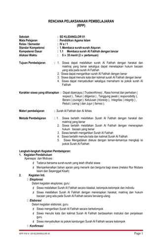 Rencana Pelaksanaan Pembelajaran (RPP) ini membahas pembelajaran Pendidikan Agama Islam untuk siswa kelas IV SD tentang membaca surah-surah Alquran, yaitu surah Al-Fatihah dan Al-Ikhlas. RPP ini menjelaskan tujuan pembelajaran, materi, metode, dan penilaian pembelajaran untuk kedua surah tersebut.