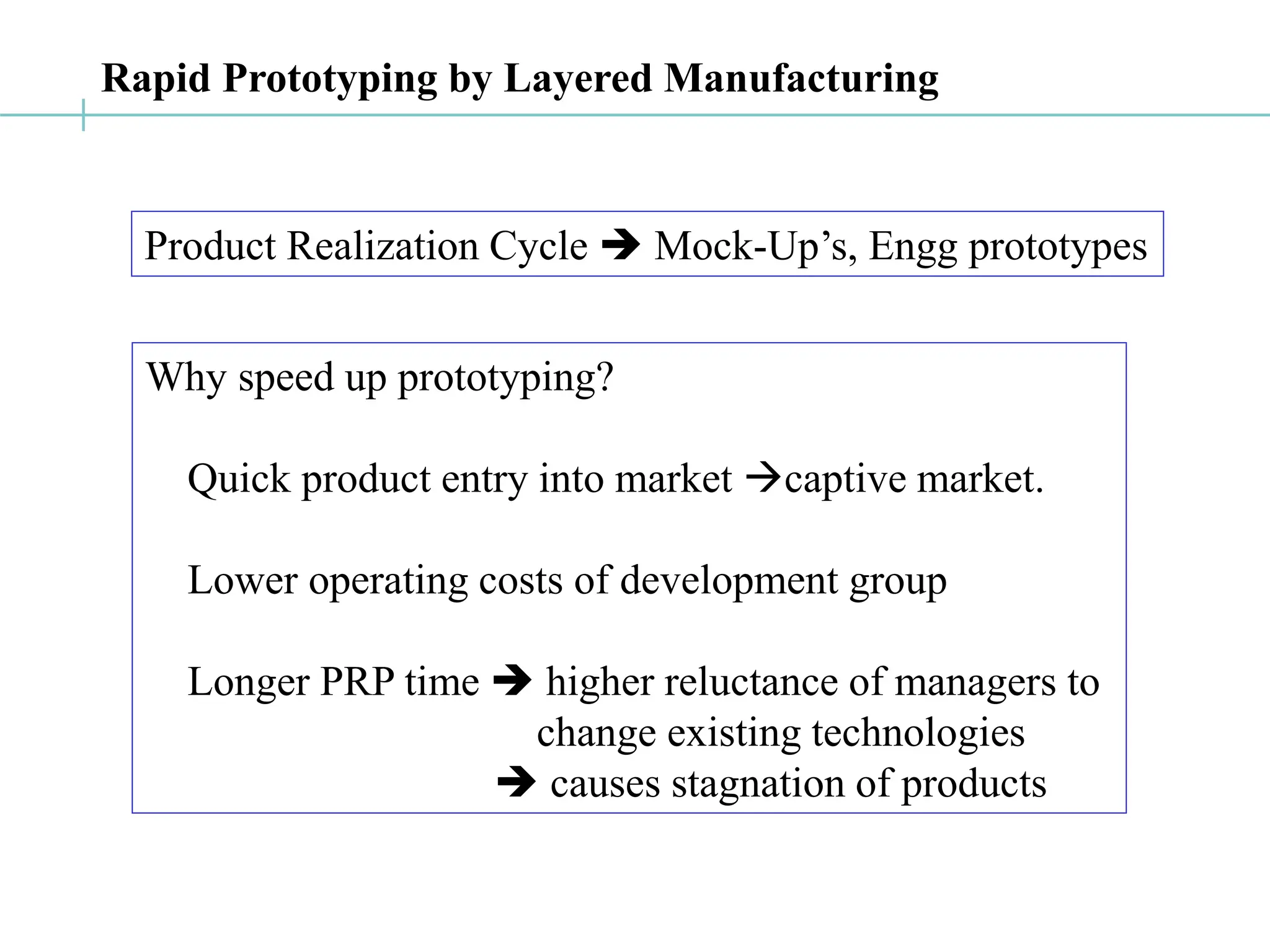 This document discusses rapid prototyping techniques such as stereolithography, selective laser sintering, fused deposition modeling, laminated object manufacturing, and 3D printing. It provides details on the processes, companies that develop the technologies, and applications. Rapid prototyping allows for quick fabrication of geometric shapes to create prototypes for testing form, fit, and function without using the final production materials or processes. STL files are commonly used as the standard file format for rapid prototyping systems.