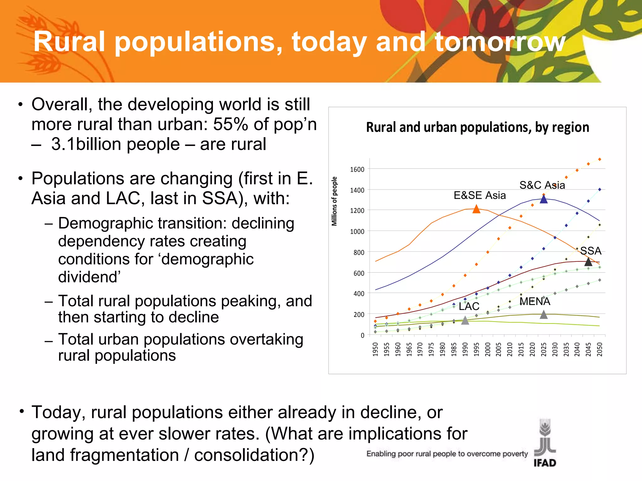 1) Most of the world's population still lives in rural areas, though populations are shifting to urban centers, especially in Asia and Latin America.