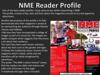 The document discusses reader profiles from music magazines NME and KERRANG!. It notes that NME's profile uses a collage of images and statistics about gender and ages to represent its audience. KERRANG!'s profile includes basic information about the magazine and reader's lifestyles, including median age, age range, gender, and hobbies. Based on researching these profiles, the author decides their own profile will include target audience images, price, release frequency, statistics, lifestyle facts, article focuses, and a basic color scheme, keeping it simple and straight to the point.
