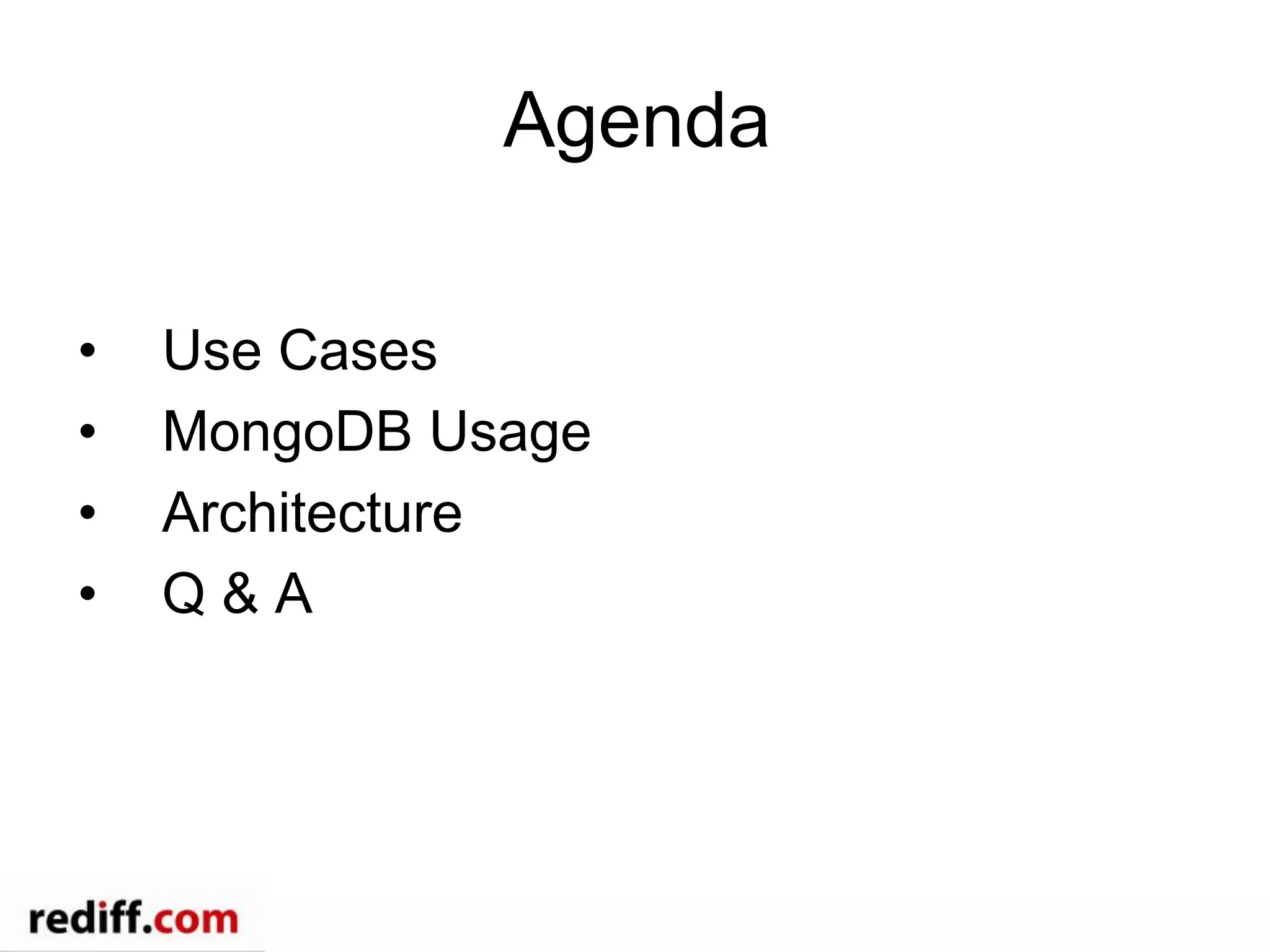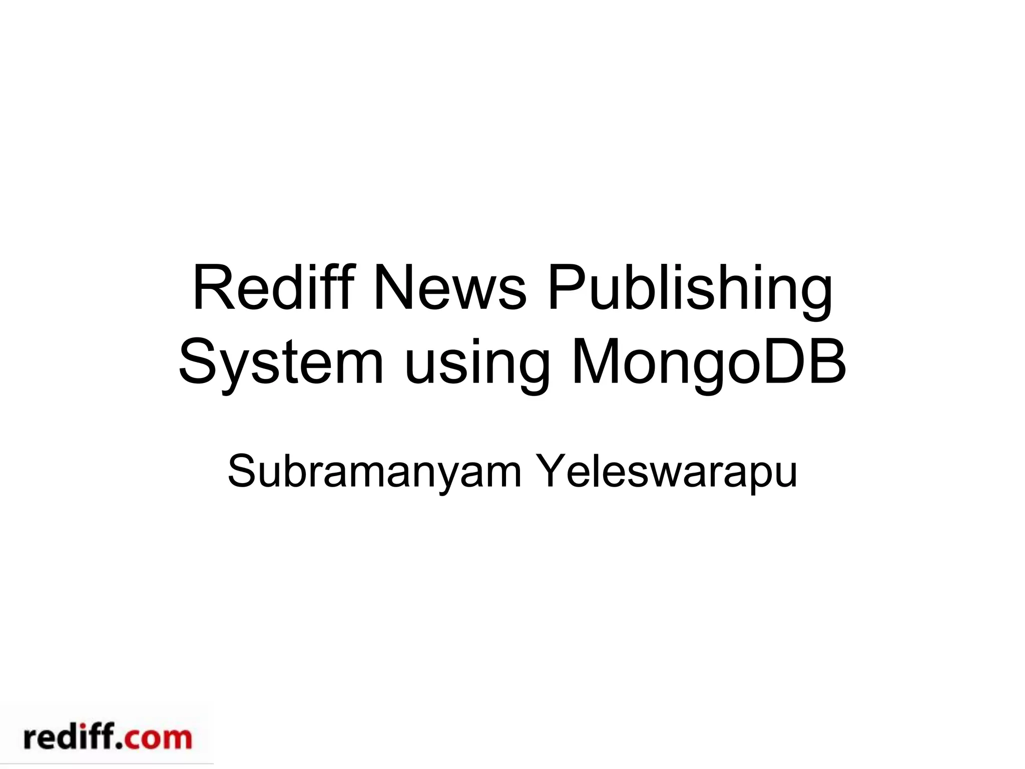 - Rediff News uses MongoDB for its publishing system to manage the lifecycle of articles, store article metadata and roles, acquire external feeds, enable tagging and notifications, and power search and data visualization on maps.