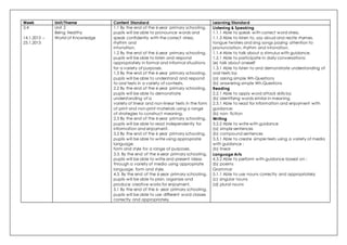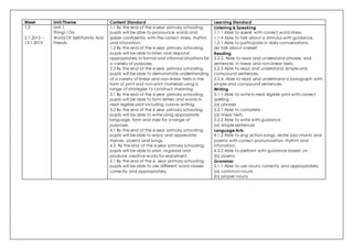 This document outlines the content and learning standards for 6 units taught over 18 weeks in a primary school. Each unit covers topics like health, family, neighborhood, and pets. The standards cover areas like speaking, listening, reading, writing, language arts and grammar. Specific skills are listed for each standard, such as speaking with correct pronunciation, reading sentences, writing sentences, enjoying poems and using nouns/pronouns correctly.