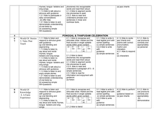 This document outlines a yearly scheme of work for an English class at SJKT Batu Caves. It is divided into 10 weeks covering various themes like "World of Self", "World of Stories", and "World of Knowledge". Each week focuses on different language skills like listening, speaking, reading, writing, language arts and grammar. The document lists learning outcomes and assessment criteria for students in each skill area over the 5 school days in a week.