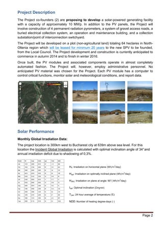 This document summarizes a proposed 10 MWp solar PV farm project in Romania. Key details include: