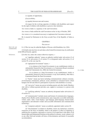 The document is the Rights of Persons with Disabilities Act of 2016 in India. It aims to give effect to the UN Convention on the Rights of Persons with Disabilities. Some key points covered are: establishing the rights of persons with disabilities to equality, life with dignity and prohibiting discrimination; protecting women and children with disabilities; ensuring rights to community living and protection from abuse; and mandating accessibility of public services including polling stations.