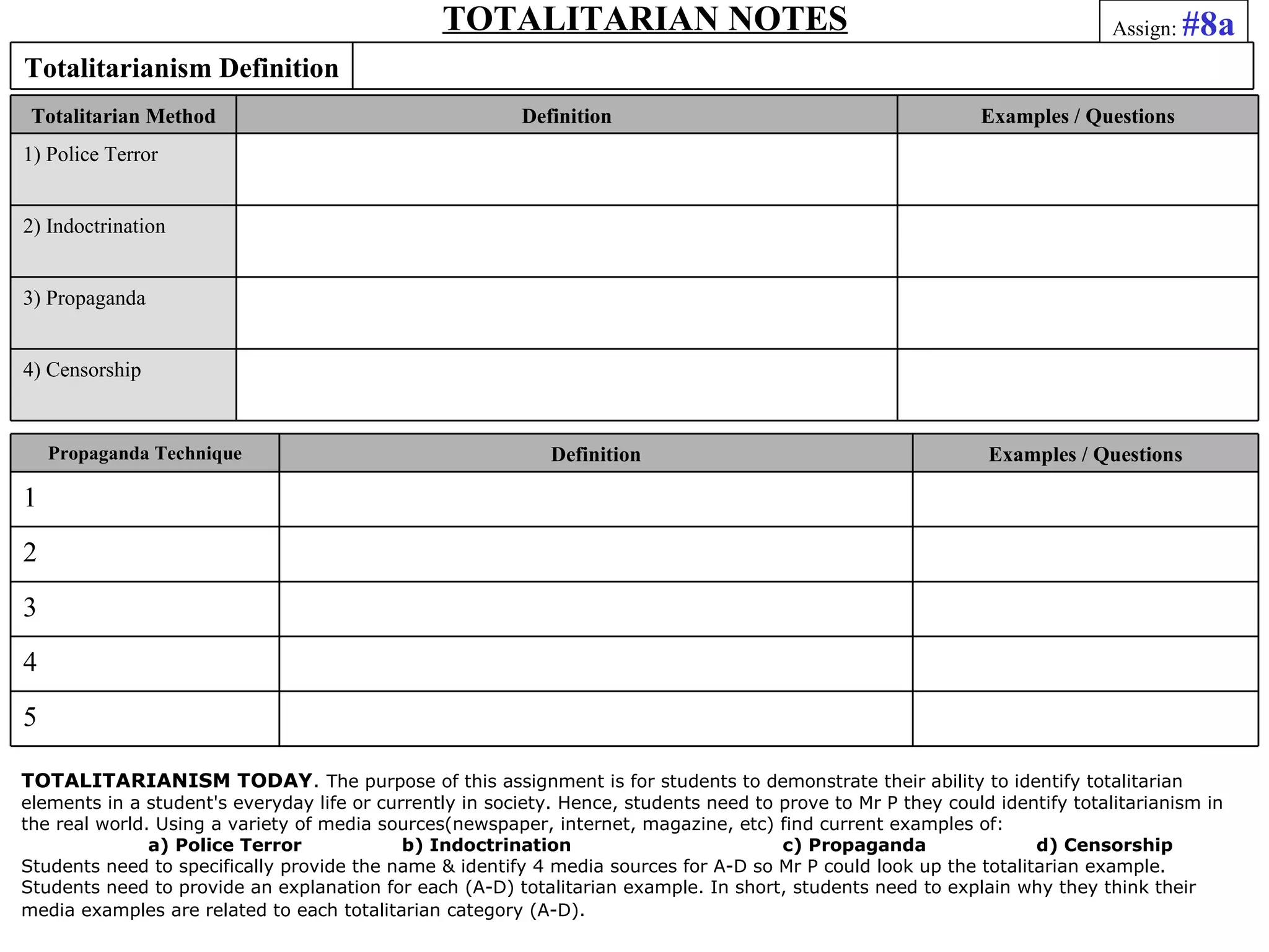 The document outlines an assignment focused on identifying totalitarian elements in everyday life, requiring students to explore concepts like police terror, indoctrination, propaganda, and censorship through various media sources. Students are tasked with presenting current examples and explanations for each category, demonstrating how these elements are visible in modern society. Additionally, the document defines various propaganda techniques such as bandwagon, name calling, faulty cause and effect, generalization, and mass distraction.