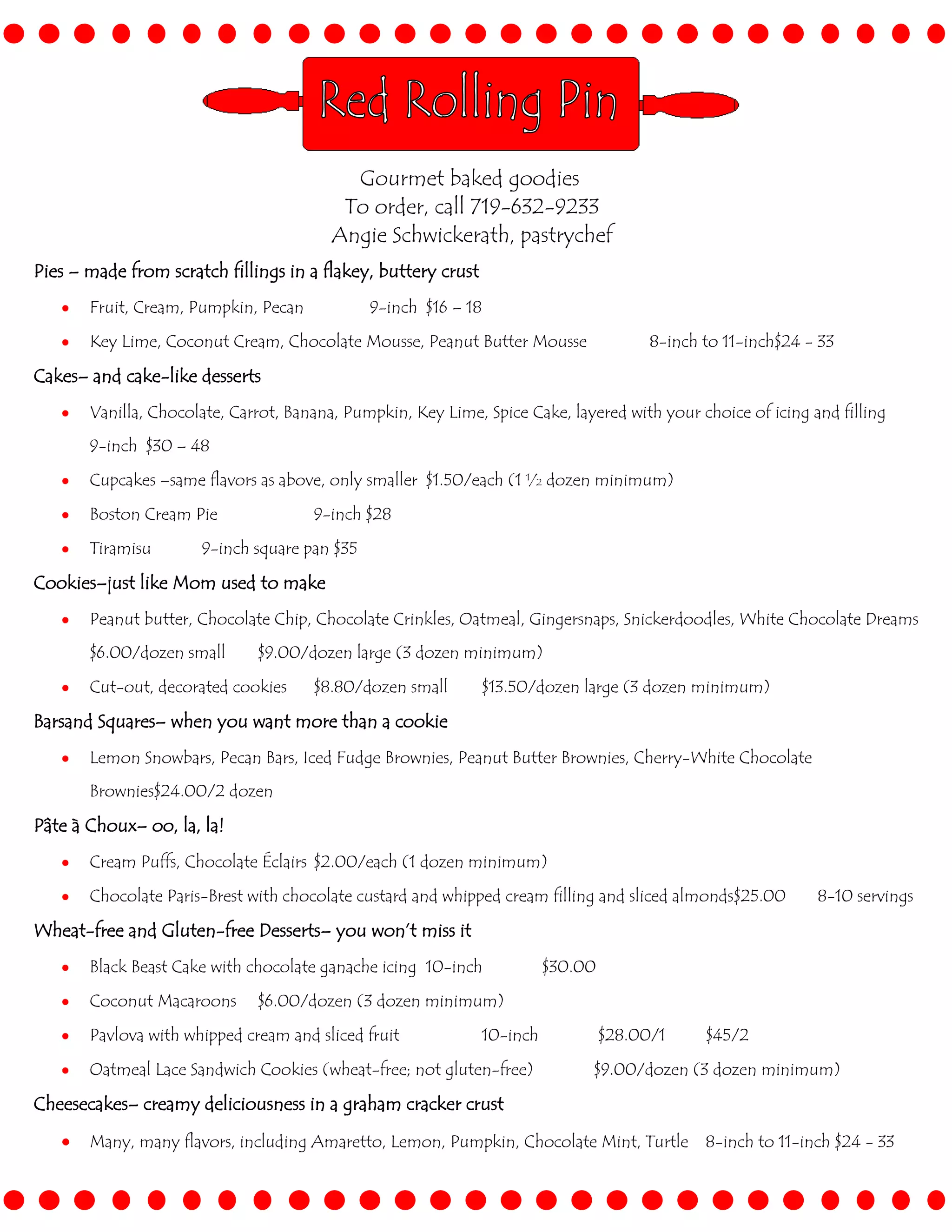 Angie Schwickerath's gourmet baked goods business offers a variety of homemade pies, cakes, cookies, bars, pastries, and cheesecakes. Pies range in price from $16-33 and cakes from $30-48. Cookies are sold by the dozen for $6-13.50. Bars and brownies are sold for $24 per 2 dozen. Cream puffs and eclairs are $2 each with a minimum order of 1 dozen. Specialty items include gluten-free black forest cake for $30 and wheat-free oatmeal lace cookies for $9 per dozen. To order, call the number provided.