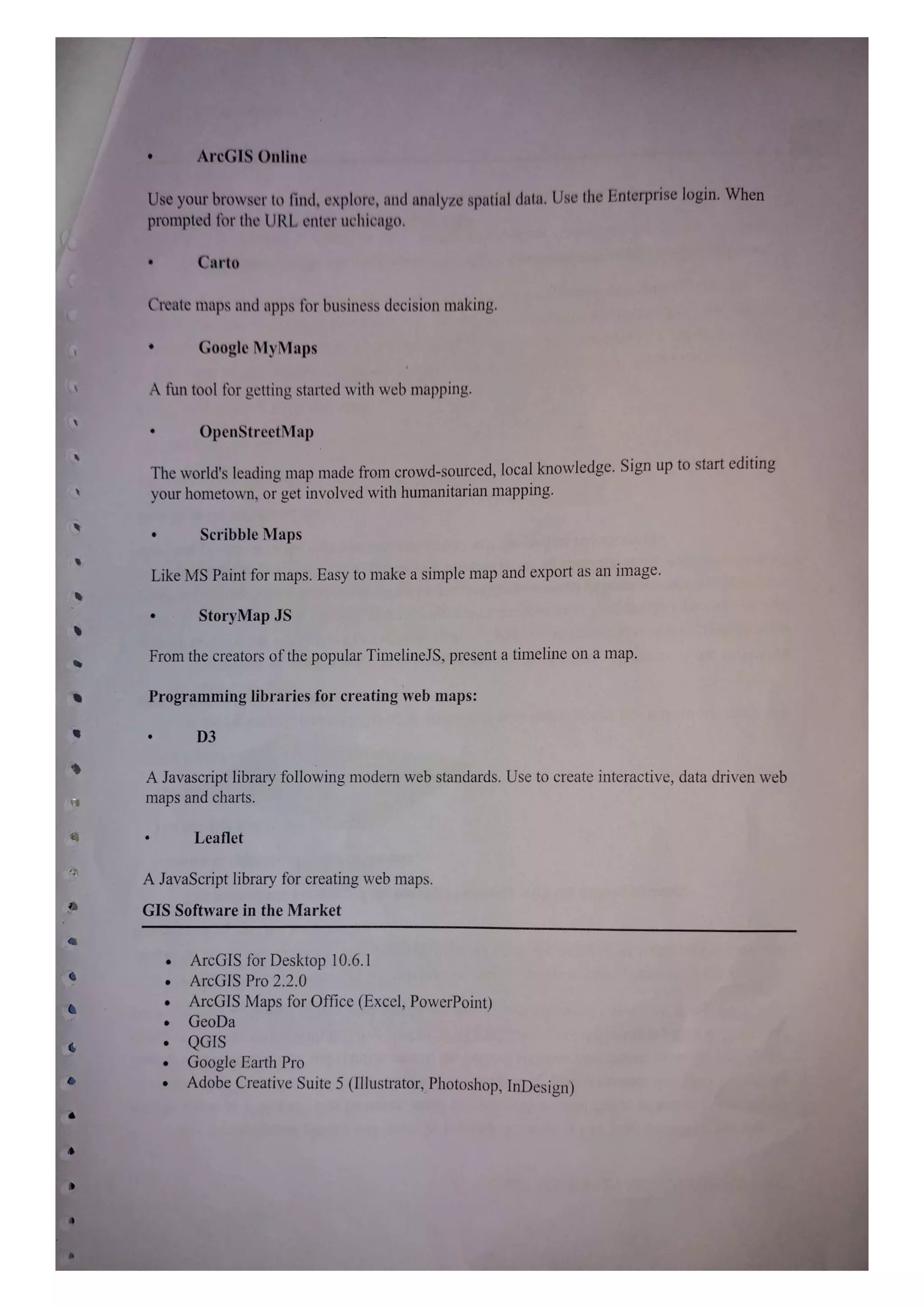This document provides instructions for accessing and using various GIS software tools remotely or locally, including ArcGIS Online, ArcGIS for Desktop, GeoDa, QGIS, and Google Earth Pro. It also lists some popular web GIS tools and programming libraries for creating web maps. Finally, it describes the major geoprocessing tools in GIS like buffers, clips, merges, dissolves, intersects, and unions; and provides steps for importing and exporting GIS data between AutoCAD and Revit software.