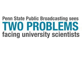 Penn State Public Broadcasting aims to address two problems with their "Real Scientists" initiative: a lack of understanding of scientists among the public and declining interest in science careers among students. The initiative will produce video profiles and digital learning objects featuring real scientists to showcase science as an exciting career and increase understanding of scientists as real people doing meaningful work. Penn State's large reach through its websites and partnerships with other organizations means the "Real Scientists" content can potentially reach millions and help promote science.