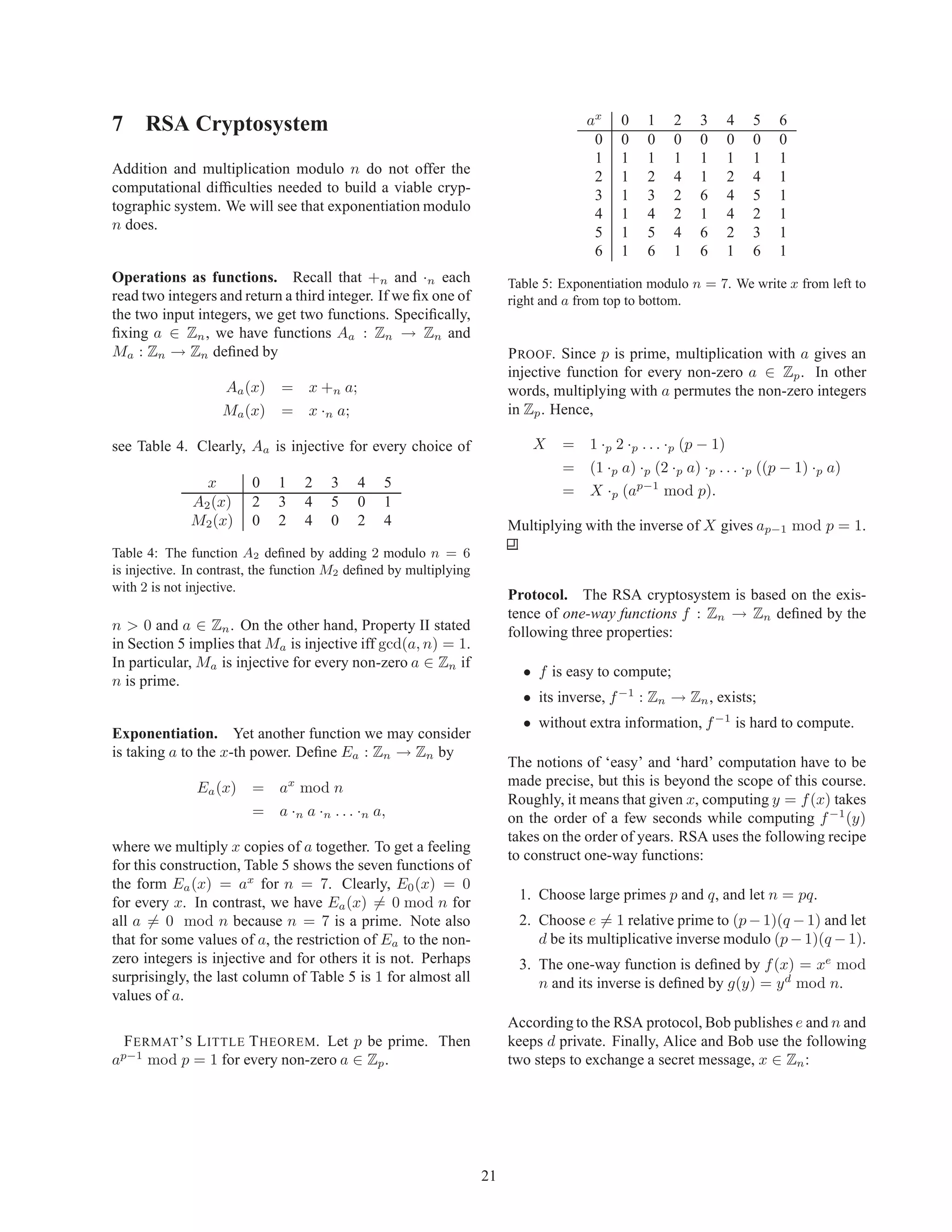 The document summarizes the RSA cryptosystem. It discusses how exponentiation modulo n can be used to build a cryptographic system by defining functions that are easy to compute but hard to invert without extra information. RSA works by choosing large prime numbers p and q, and using exponentiation with keys to encrypt and decrypt messages modulo n=pq. While RSA provides a practical cryptosystem, there is no proof it is theoretically secure or that factoring large numbers is inherently hard.