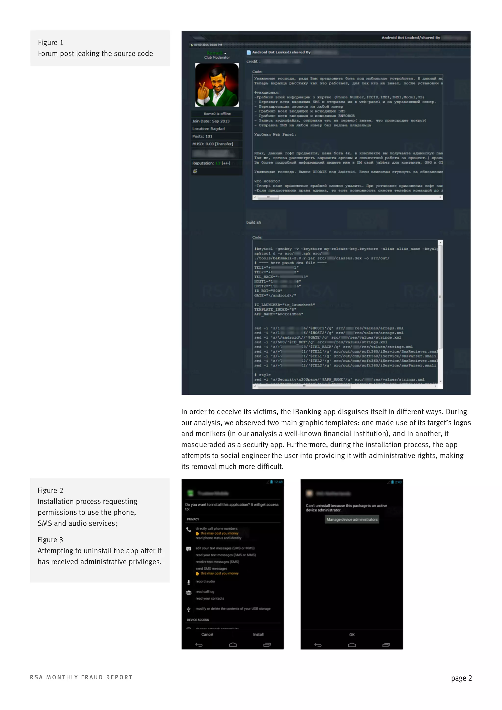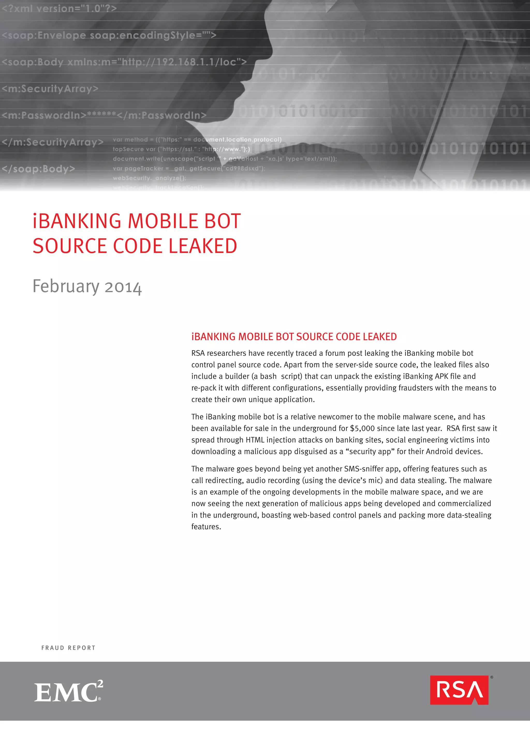 The iBanking mobile bot source code was leaked in February 2014, providing fraudsters with the ability to create tailored malicious applications aimed at stealing user data. This malware, which includes features such as SMS interception, call redirection, and audio recording, poses significant risks for mobile security, especially as it facilitates advanced phishing attacks. Moreover, the leaked web-based control panel empowers botmasters to manage infected devices effectively, potentially leading to a rise in mobile botnet-as-a-service offerings in the underground market.