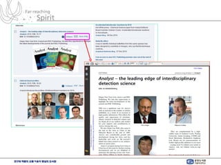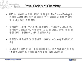 Rsc 1. 2. RSC 는 1890 년 설립된 비영리 학회 ( 전 The Chemical Society) 로 전세계 45,000 명의 회원을 가지고 있는 유럽에서 가장 큰 규모를 지니고 있는 화학 학회 주제분야 : 화학 ( 무기화학 , 물리화학 , 유기화학 , 나노화학 , 분석화학 , 일반화학 , 식품화학 , 재료 및 고분자화학 , 응용 및 공업 화학 , 환경화학 , 바이오분자화학 ) 원문정보 구축년도 및 제공년도 : 2000 년 ~ Current ( 저널마다 다름 ) 저널종수 : 기본 21 종 + 3 데이터베이스 , 추가저널 패키지 6 종 + 1 데이터베이스 뉴저널 패키지 6 종 , RSC 아카이브 Royal Society of Chemistry 3. A B D RSC 웹사이트 A. RSC 의 출판물을 포함하여 협회관련 소식 및 이벤트에 대한 안내 B. 관련분야의 새로운 소식 C. 영국에 있는 Chemistry Centre 의 시설과 이벤트 소식 D. 빠른 검색과 이동이 가능한 Quick Search 및 Quick Menu C 4. RSC 저널 A. RSC 저널로의 이동 메뉴 B. 저널 관련 소식 5. A B C 저널 홈페이지 Advance Articles : 인쇄저널로 출판되기 전 온라인에서 먼저 이용이 가능한 기능 . ( 보통 30-40 일 정도 빠름 ) 저널 브라우즈 , Issue 검색 저널 아티클 검색 6. 7. 8. 자료 검색 : 키워드 입력 상세검색 화면 전체 검색 결과 9. 10.