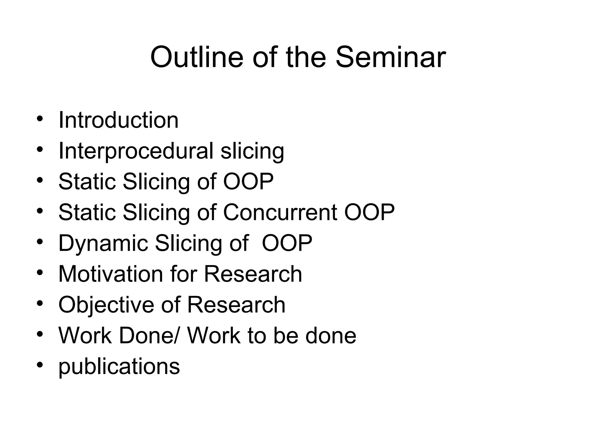 - The document summarizes techniques for slicing object-oriented programs. It discusses static and dynamic slicing, and limitations of previous approaches.