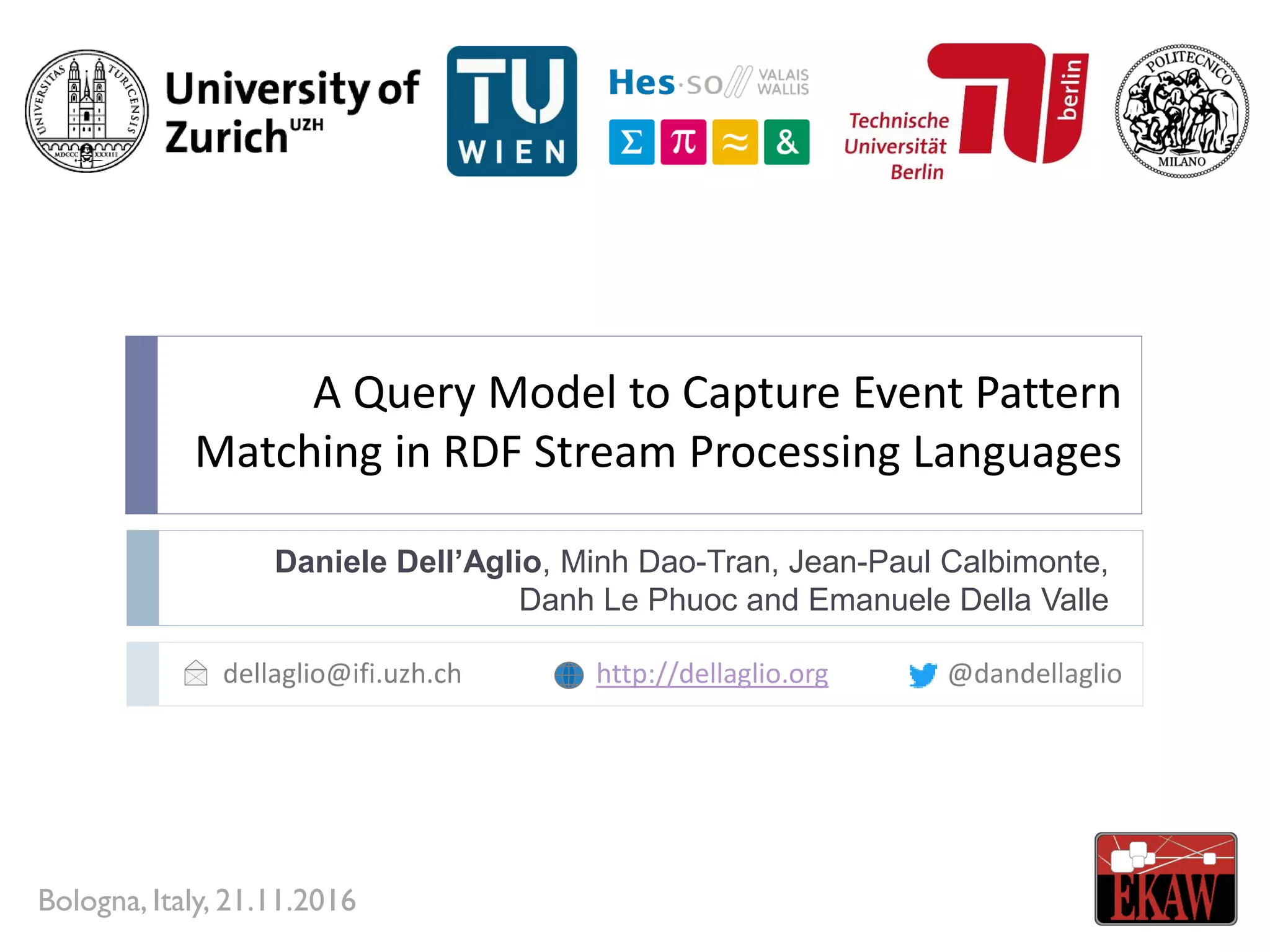 This document proposes a query model called RSEP-QL to capture event pattern matching in RDF stream processing languages. It presents RSEP-QL's data model of RDF streams and windows, basic operators like EVENT and SEQ, and evaluation semantics. The goal is to provide a reference model for comparing different RSP query languages and studying related problems in a standardized way.