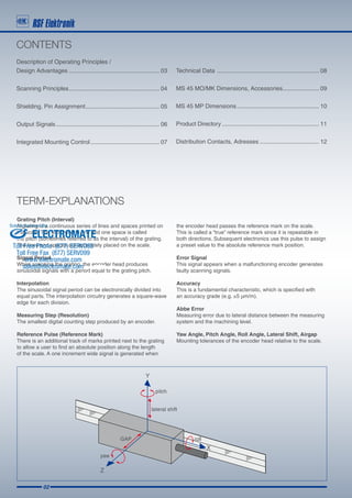 The document discusses the MS 45 series of exposed linear encoders. It provides details on their scanning principles, output signals, technical specifications, and dimensions. The encoders use a singlefield reflective scanning method with a 200 micrometer grating pitch. They are designed for contamination resistance, high resolution, speed, and easy mounting.