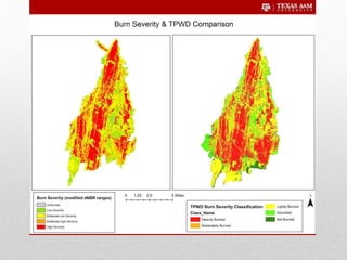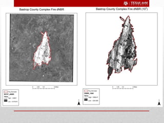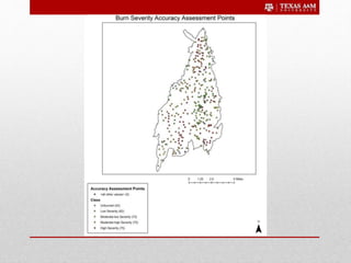 The document summarizes a study that assessed the burn severity of the 2011 Bastrop County Complex Fire in Texas using satellite imagery and remote sensing indices. The study analyzed pre-fire and post-fire Landsat 5 imagery to calculate Normalized Burn Ratio (NBR) and difference Normalized Burn Ratio (dNBR) values. These were classified into 5 burn severity classes and assessed for accuracy, finding moderate agreement. The modified classification approach was determined to more accurately represent the full burn severity spectrum.