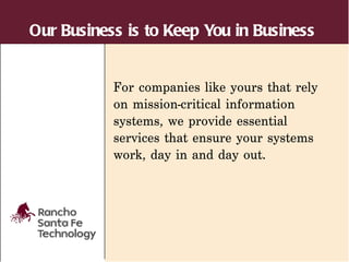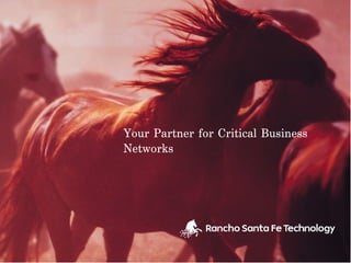 Rancho Santa Fe Technology provides essential services to ensure critical business networks are always functioning. They design, construct, and optimize data centers to allow companies to stay operational under any circumstances. They also install and maintain communications infrastructure through activities like cabling systems deployment and IT equipment provisioning. Rancho Santa Fe Technology aims to quickly solve service issues through field technicians so clients' businesses can run without interruption.
