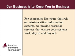 Rancho Santa Fe Technology specializes in providing essential services for mission-critical information systems, ensuring their continuous operation through data center design, maintenance, and communications infrastructure solutions. Established in 1991, the company emphasizes customer needs and rapid service responses, with offices in California and Arizona to support a variety of clients including major corporations and government agencies. Their expertise includes creating optimized data centers and maintaining reliable network infrastructures to avoid system downtimes.