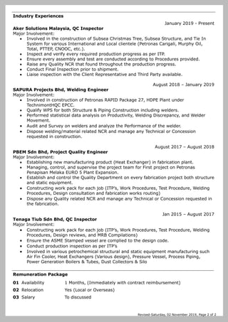 Muhammad Hafiz Bin Zullaile is a welding engineer, QC inspector, and inspection coordinator with over 5 years of experience in the fabrication and inspection of static equipment for oil and gas processing plants and subsea systems. He is proficient in welding inspection, metrology, NDT methods, and quality documentation. Currently he works as a QC inspector for Aker Solutions Malaysia, where he inspects and verifies the construction of subsea trees, structures, and tie-in systems. Previously he held welding engineering and quality engineering roles with Sapura Projects and PBEM, where he established quality systems and ensured compliance with ASME and client standards. He holds relevant welding and quality certifications.