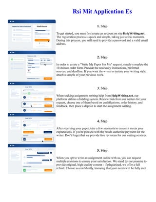 The document provides instructions for requesting writing assistance from HelpWriting.net in 5 steps: 1) Create an account with a password and email. 2) Complete a 10-minute order form providing instructions, sources, and deadline. 3) Review bids from writers and choose one based on qualifications. 4) Review the completed paper and authorize payment if satisfied. 5) Request revisions to ensure satisfaction, with a refund option for plagiarized content.