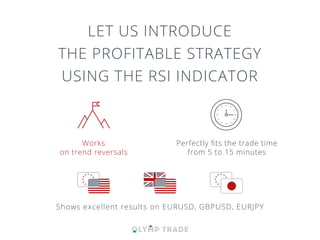 The document introduces the RSI indicator strategy for trend reversals on timeframes of 5-15 minutes for currency pairs like EURUSD and GBPUSD. It explains that RSI shows when the price is overbought or oversold, signaling trend reversals back within its 30-70 trading range. It provides instructions on how to set up the RSI indicator on a 1-minute candle chart using a period of 5, and describes buying put options when RSI drops below 70 from overbought conditions or call options when RSI rises above 30 from oversold conditions.
