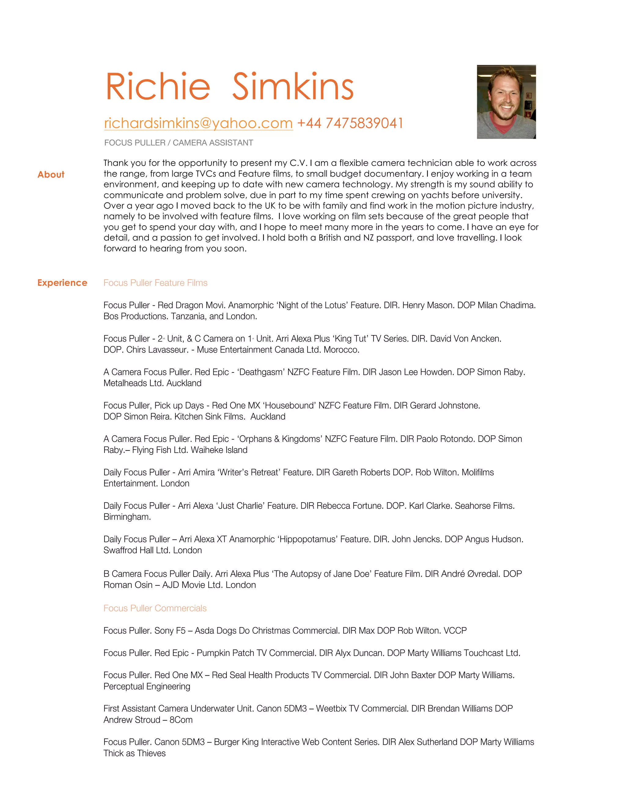 Richie Simkins has over 10 years of experience as a camera assistant and focus puller in New Zealand and the UK, working on both features films and commercials. He has experience with cameras including the Arri Alexa, Red Epic, and Canon DSLRs. He is skilled in video assist operation, data wrangling, and enjoys collaborating in fast-paced production environments. Richie holds both British and New Zealand citizenship and is looking for new opportunities in the film industry.