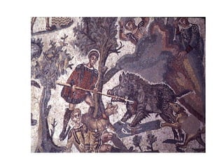 Roman hunts involved hunters taking positions with weapons while slaves tracked animals with hunting dogs. When animals fled from hiding, the pursuit began as dogs chased them, being pelted by stones and cries until they were caught in nets or finished off in hand-to-hand combat if they stood their ground against attackers.