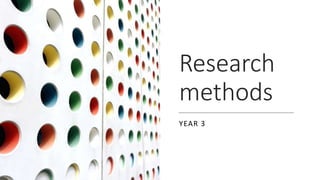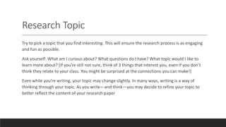 The document provides guidance on various aspects of conducting research such as choosing a topic, developing research questions and objectives, conducting a literature review, and ensuring ethical research practices. It emphasizes that the research topic should be something the researcher finds interesting. The introduction should provide background information on the topic without overly general statements. A literature review surveys previously published work to identify the most significant information and any gaps. It is important to consider ethics around informed consent, anonymity, confidentiality, and avoiding harm or bias.