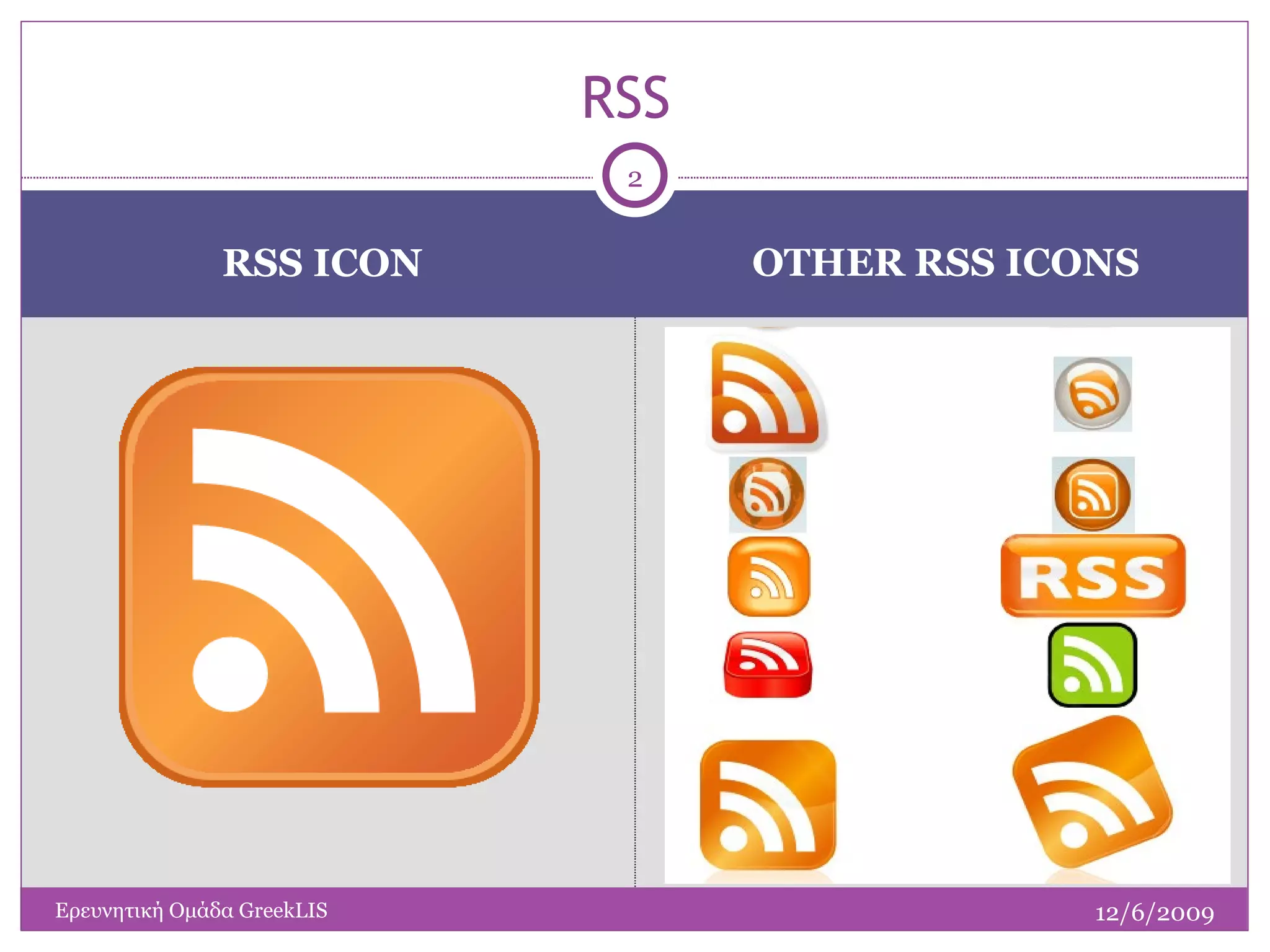 Τι είναι το RSS " R eally S imple S yndication" Το RSS ειδοποιεί τους χρήστες του Internet για τις καινούργιες ενημερώσεις που υπάρχουν στις ιστοσελίδες που τους ενδιαφέρουν. Δεν χρειάζεται πλέον να επισκέπτεστε καθημερινά όλες τις ιστοσελίδες, τα blogs κτλ. για να δείτε αν δημοσιεύτηκε κάτι καινούργιο. 12/6/2009 Ερευνητική Ομάδα GreekLIS