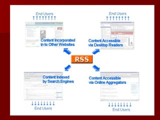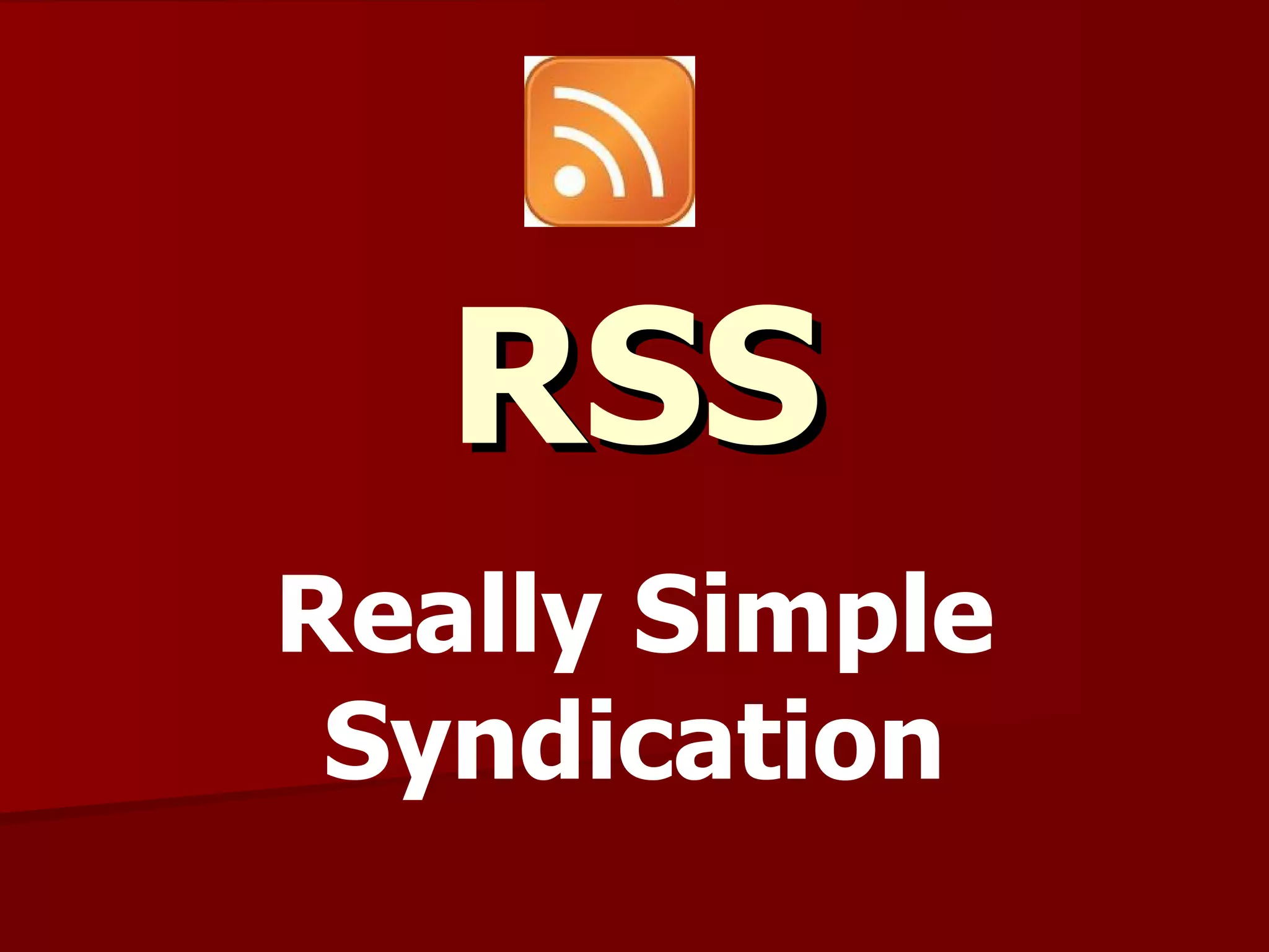 RSS ย่อมาจากคำาว่า Really Simple Syndication หรือ Rich Site Summary เป็นรูปแบบ ในการนำาเสนอข่าวหรือบทความ ให้อยู่ในรูปแบบมาตรฐาน XML เพื่อให้ผู้ที่สนใจสามารถติดตาม ข่าวสารใหม่ๆได้ทันที ได้อย่างง่ายและสะดวก โดยเราสามารถดึง ข้อมูลจากเว็บไซต์ต่างๆ ที่มีบริการ RSS นี้ได้โดยตรง และทันที เช่นนำา ติดตามข้อมูลสินค้าของ TARAD.com หรือ ข้อมูลข่าวสาร จากเว็บไซต์ของ กรุงเทพธุรกิจ ได้ ทันที ผ่านหน้าเว็บหรือโปรแกรม ที่นำามาลงไว้ที่เครื่องของ โดยข้อมูลที่แสดงจะเป็นข้อมูลที่มี การอัพเดทอยู่ตลอดเวลา จาก แหล่งข้อมูลโดยตรง โดยที่ผู้ใช้จะไม่ จำาเป็นต้องเข้าไปตามเว็บไซต์ต่างๆ เพื่อดูว่ามีข้อมูล อัพเดทใหม่