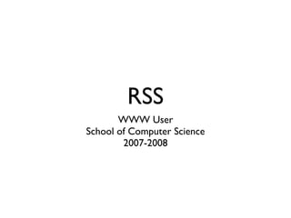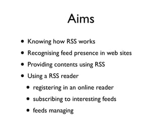 The document discusses RSS (Really Simple Syndication), which allows users to subscribe to updates from dynamic websites and receive new content as it is published. It defines RSS as a subscription technology that "pushes" new information to users from sites they follow. RSS uses XML files called feeds that are automatically updated when a website changes. It describes how users can subscribe to feeds using online or installed RSS reader programs and services like clipping, playlists, sharing, and searching. Popular free online and desktop RSS readers are also listed.