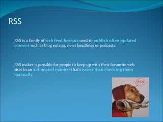 RSS is a family of web feed formats used to publish frequently updated content like blog posts, news headlines, or podcasts. RSS feeds allow users to stay up to date with their favorite websites more easily than manually checking each site. Users subscribe to RSS feeds by adding the feed's link to an RSS reader, which then regularly checks for and downloads any new content updates. Sharing content to blogs and other websites is known as syndication. RSS and Atom are common feed formats that are based on XML.