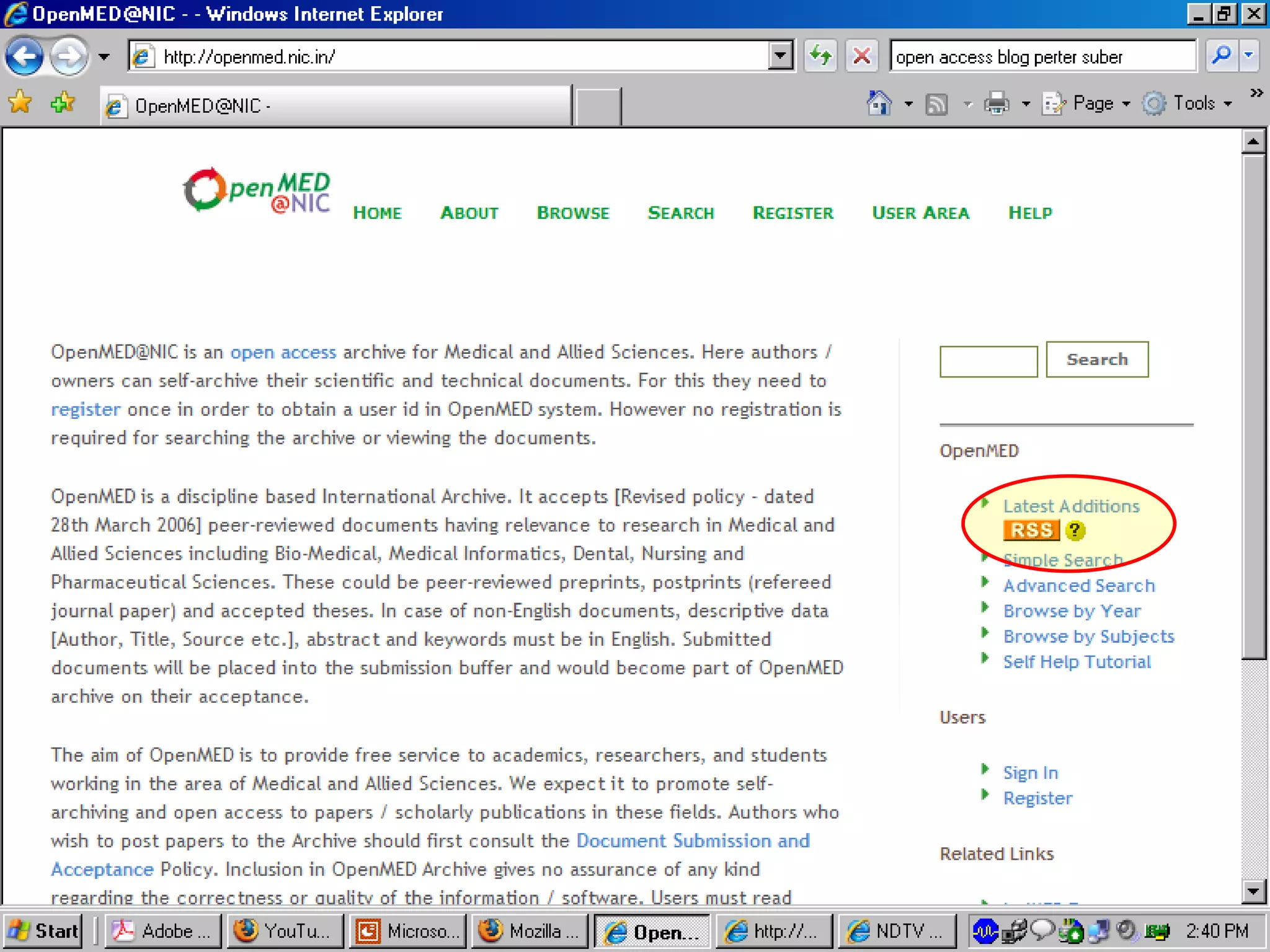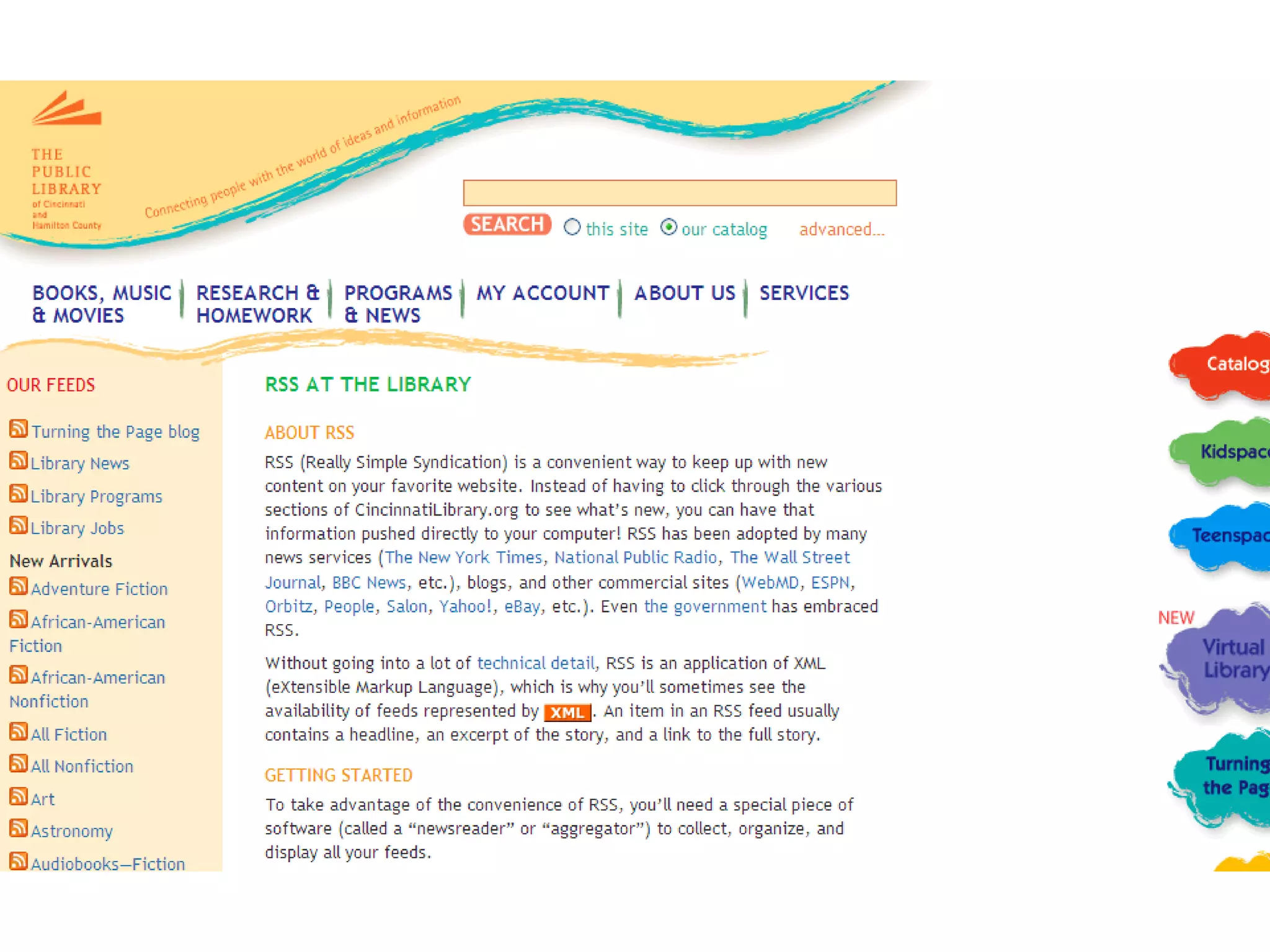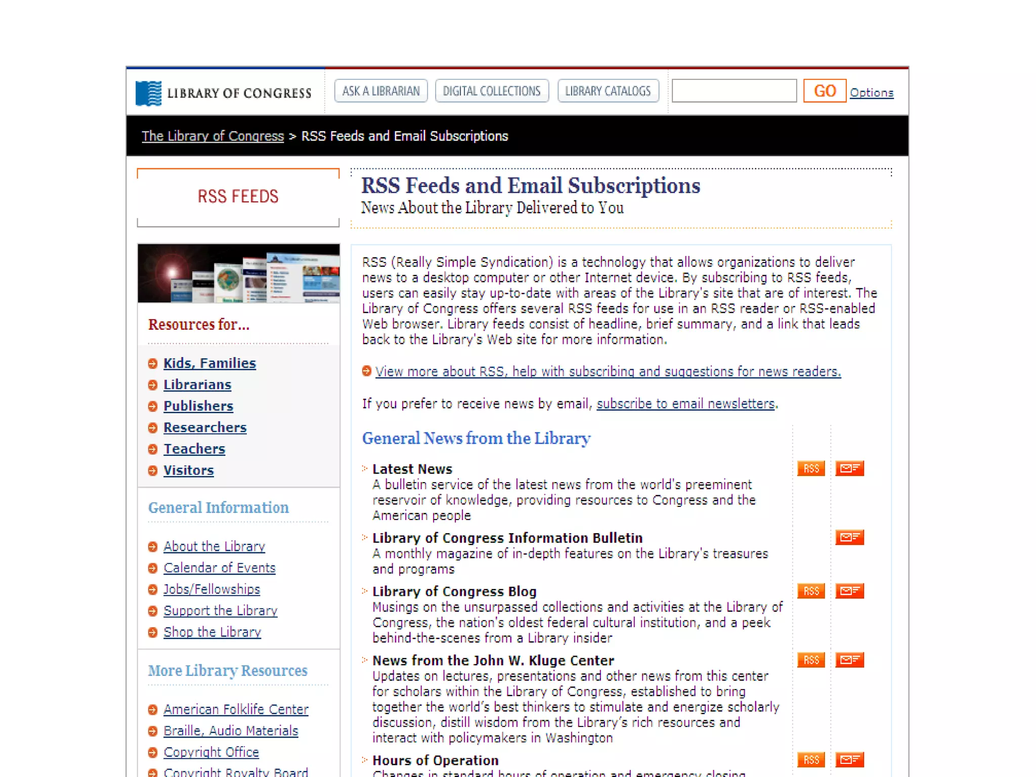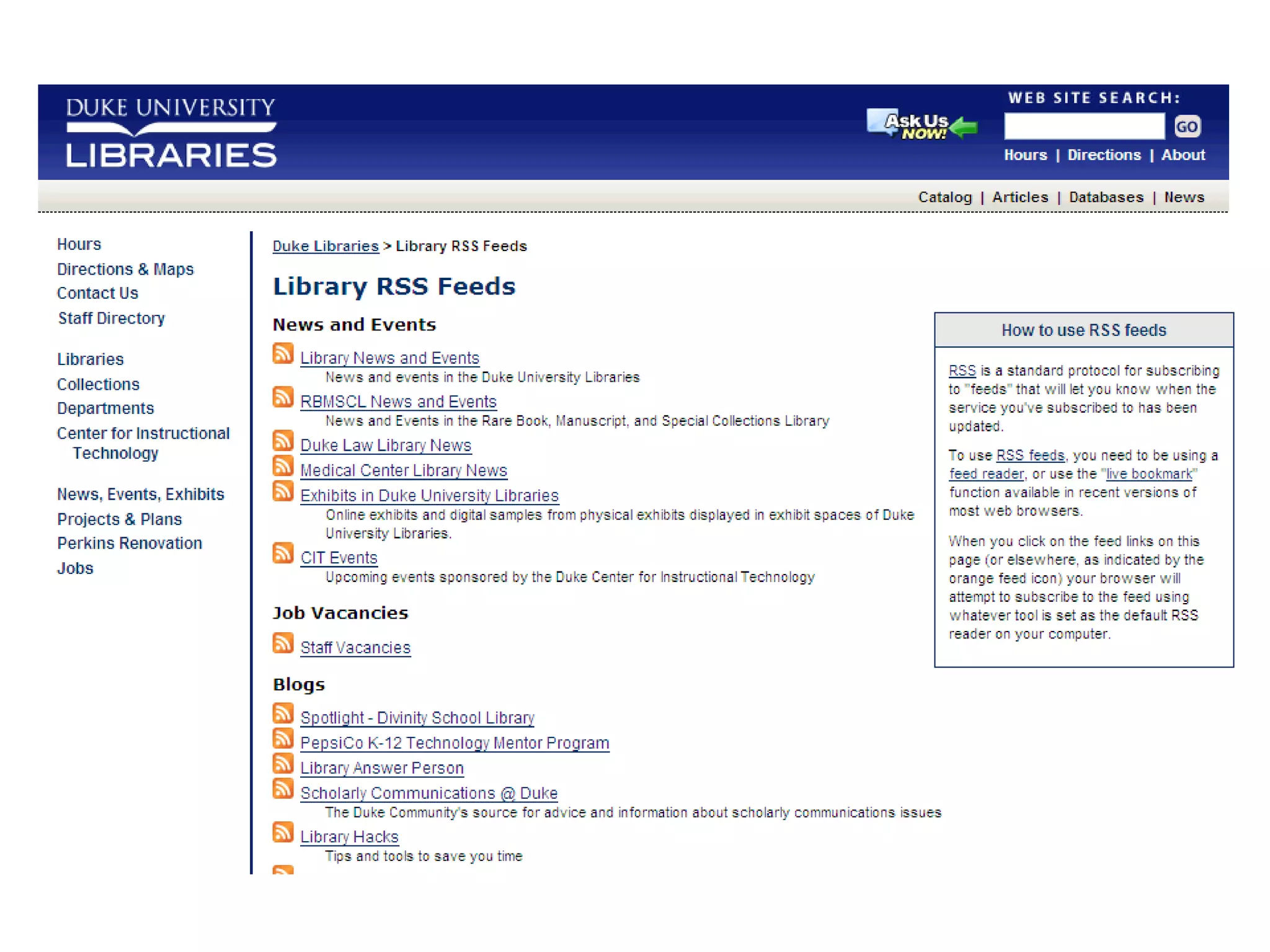 The document discusses the importance and functionality of RSS (Really Simple Syndication) in libraries for keeping users updated on relevant information without visiting multiple sites. It outlines how users can subscribe to RSS feeds from various sources such as blogs, news sites, and databases, and emphasizes the potential of libraries to utilize RSS for disseminating information about their services and resources. Additionally, it provides examples of how libraries can produce and consume RSS feeds to enhance their information services and user engagement.